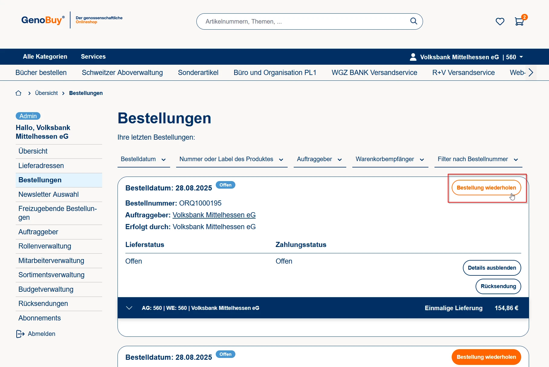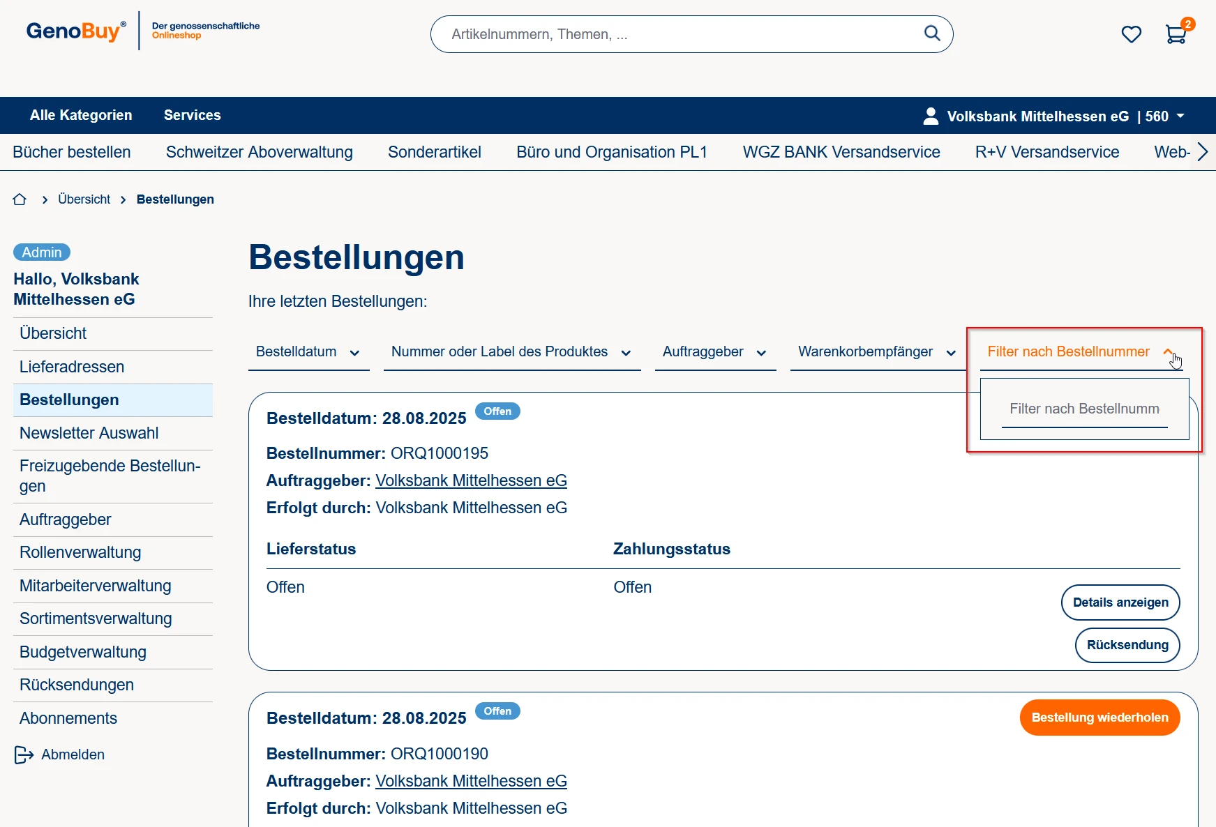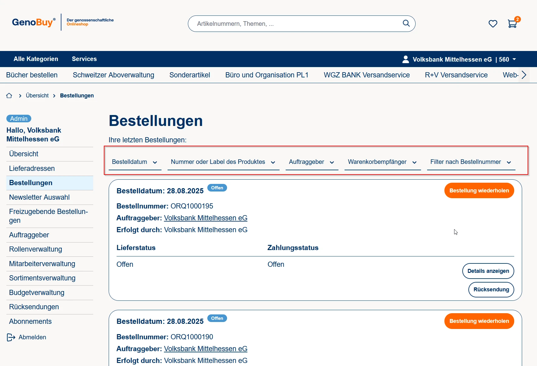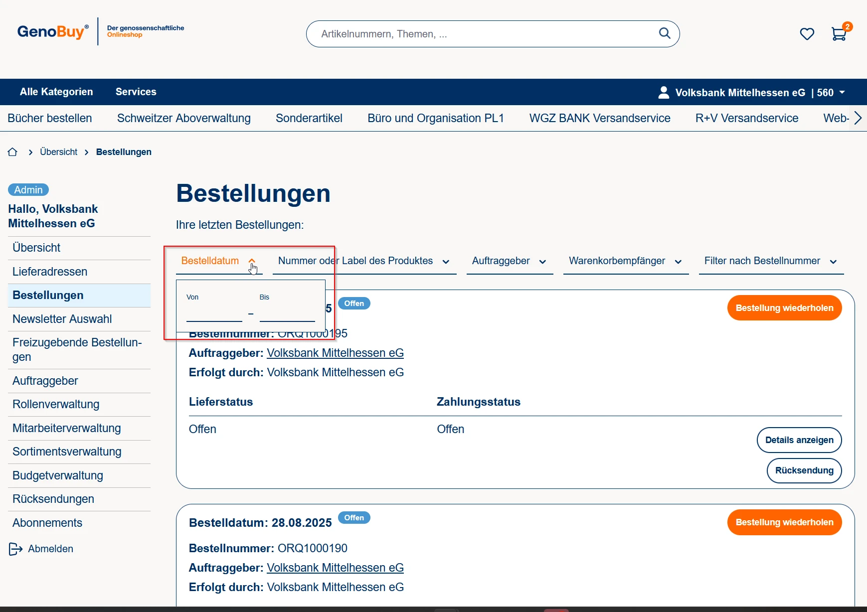 Die Bestellhistorie in GenoBuy bietet Ihnen eine strukturierte Übersicht aller getätigten Einkäufe. Sie ermöglicht es, Bestellungen schnell zu prüfen, zu analysieren und erneut aufzugeben. Sie können vergangene Bestellungen jederzeit nachvollziehen und bei Bedarf erneut aufrufen. Je nach Benutzerrolle (z. B. Basic Besteller, Konzernadministrator) können unterschiedliche Daten sichtbar sein.