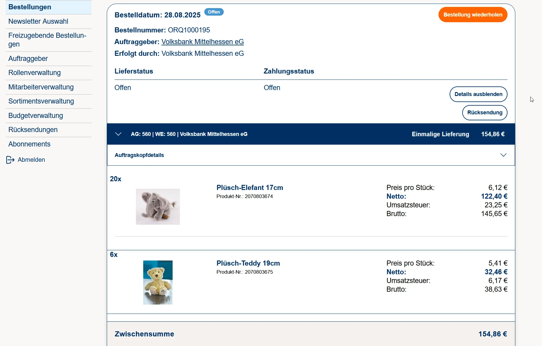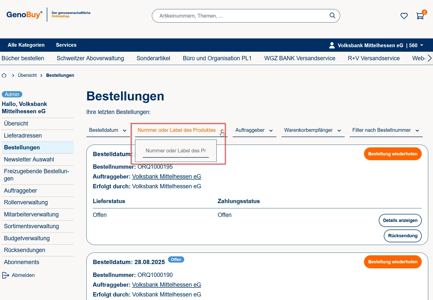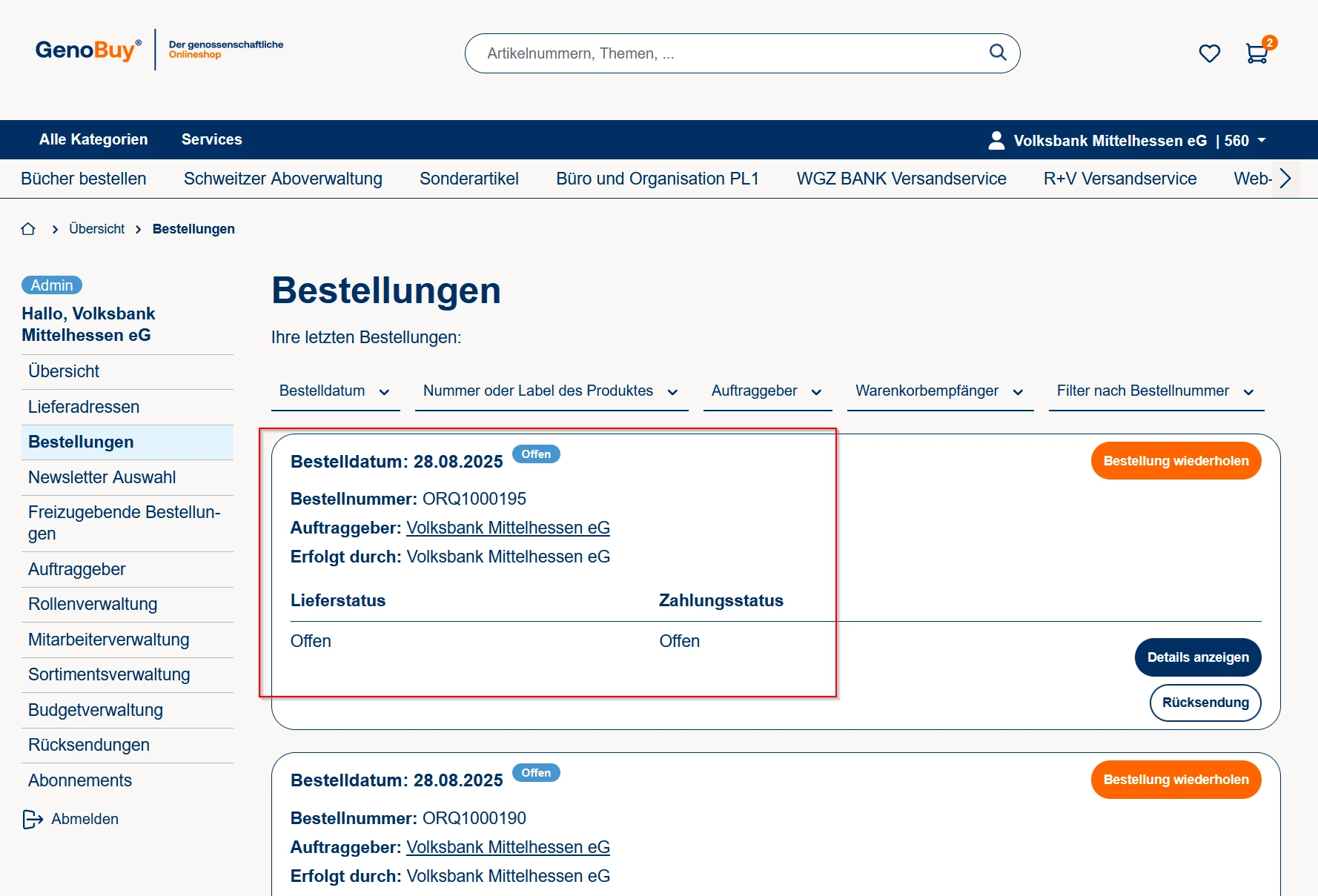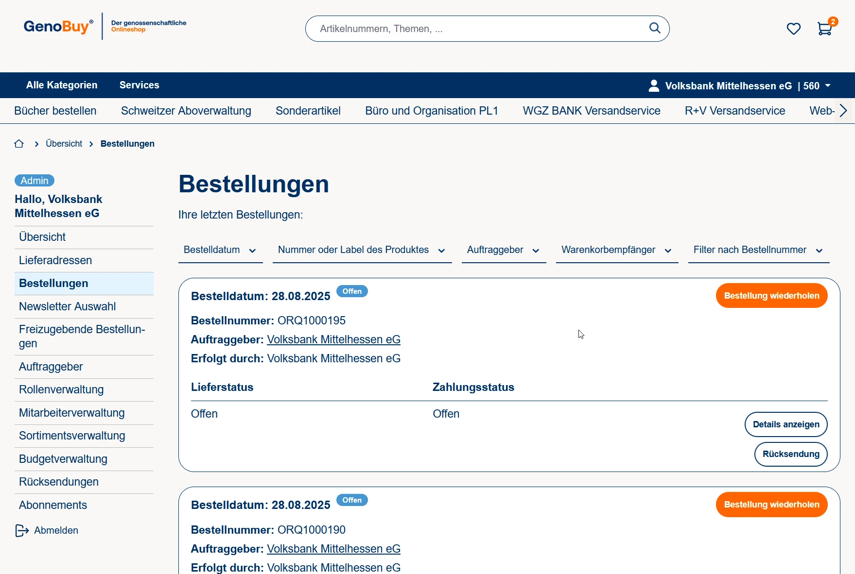 Die Bestellhistorie in GenoBuy bietet Ihnen eine strukturierte Übersicht aller getätigten Einkäufe. Sie ermöglicht es, Bestellungen schnell zu prüfen, zu analysieren und erneut aufzugeben. Sie können vergangene Bestellungen jederzeit nachvollziehen und bei Bedarf erneut aufrufen. Je nach Benutzerrolle (z. B. Basic Besteller, Konzernadministrator) können unterschiedliche Daten sichtbar sein.