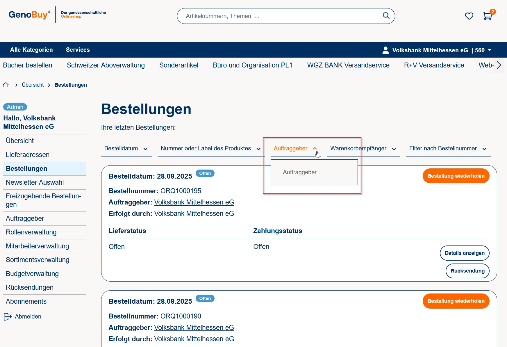 Die Auftraggebernummer ermöglicht eine Suche nach Bestellungen, die einem bestimmten Auftraggeber zugeordnet sind.