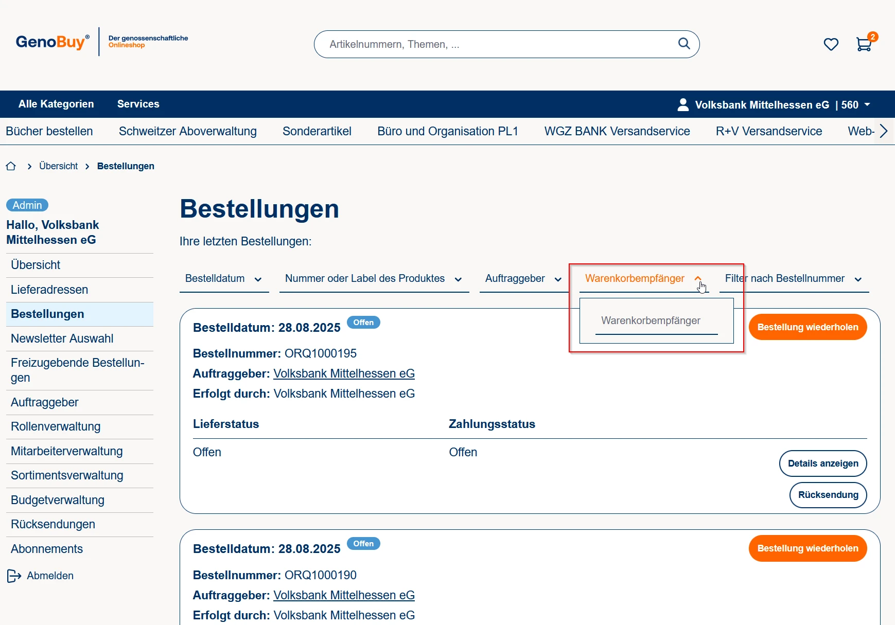 Über die Nummer des Warenkorbempfängers können Bestellungen schnell und eindeutig gefiltert werden.