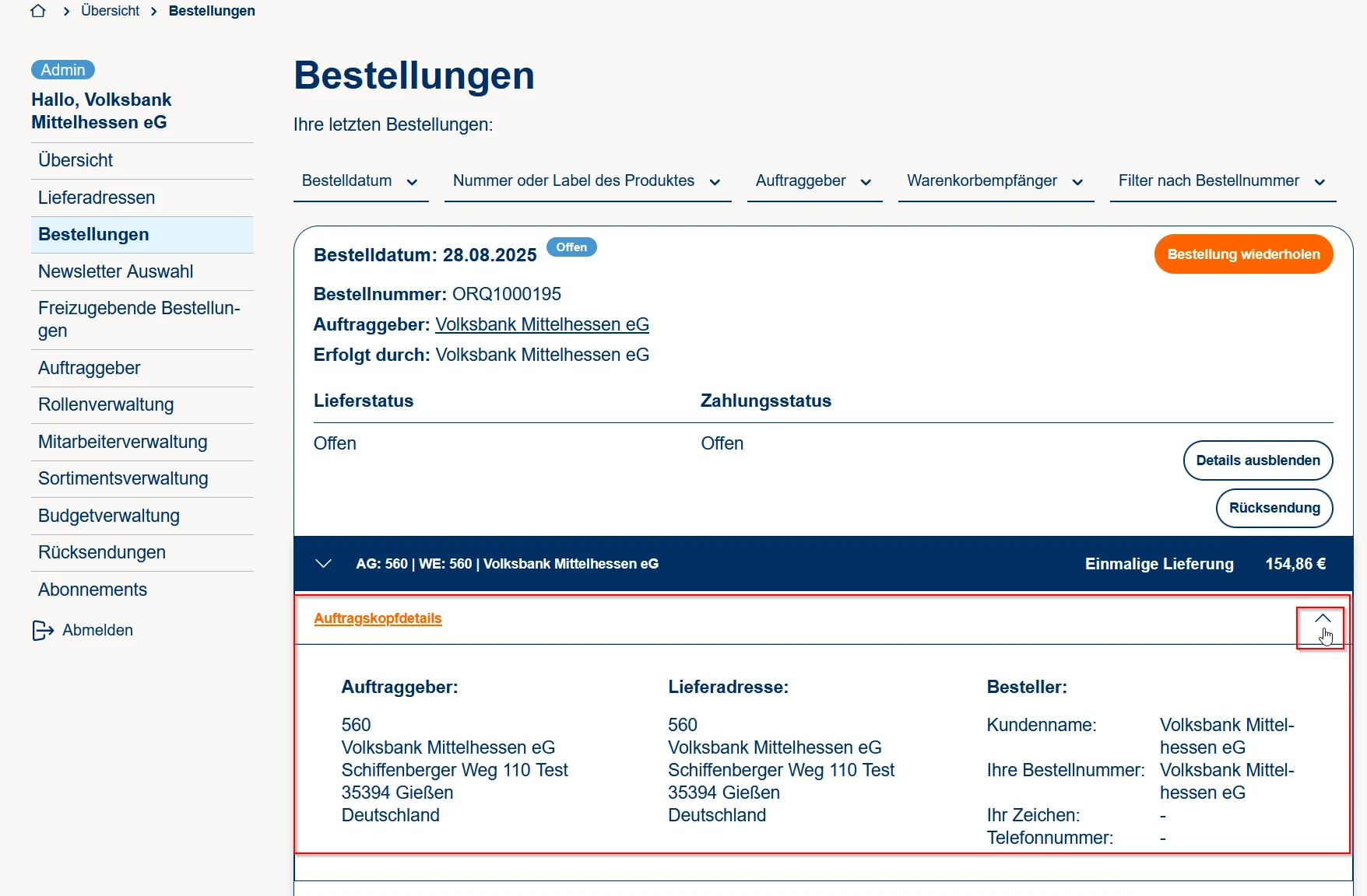 Sie finden Informationen wie Bestelldatum, Bestellnummer, Auftraggeber, Warenkorbempfänger, Lieferstatus und Zahlungsstatus.