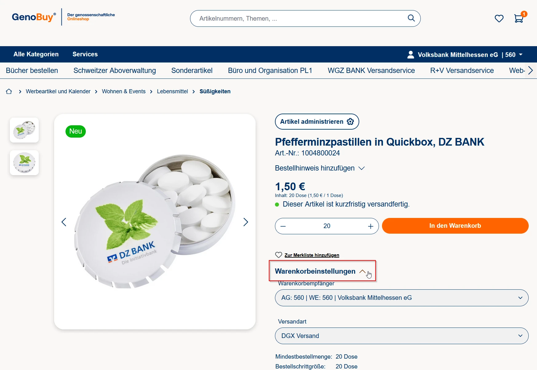 Die Funktion finden Sie auf den Produktdetailseiten. Dort können Sie die Warenkorbeinstellungen mit einem Klick aufklappen.
