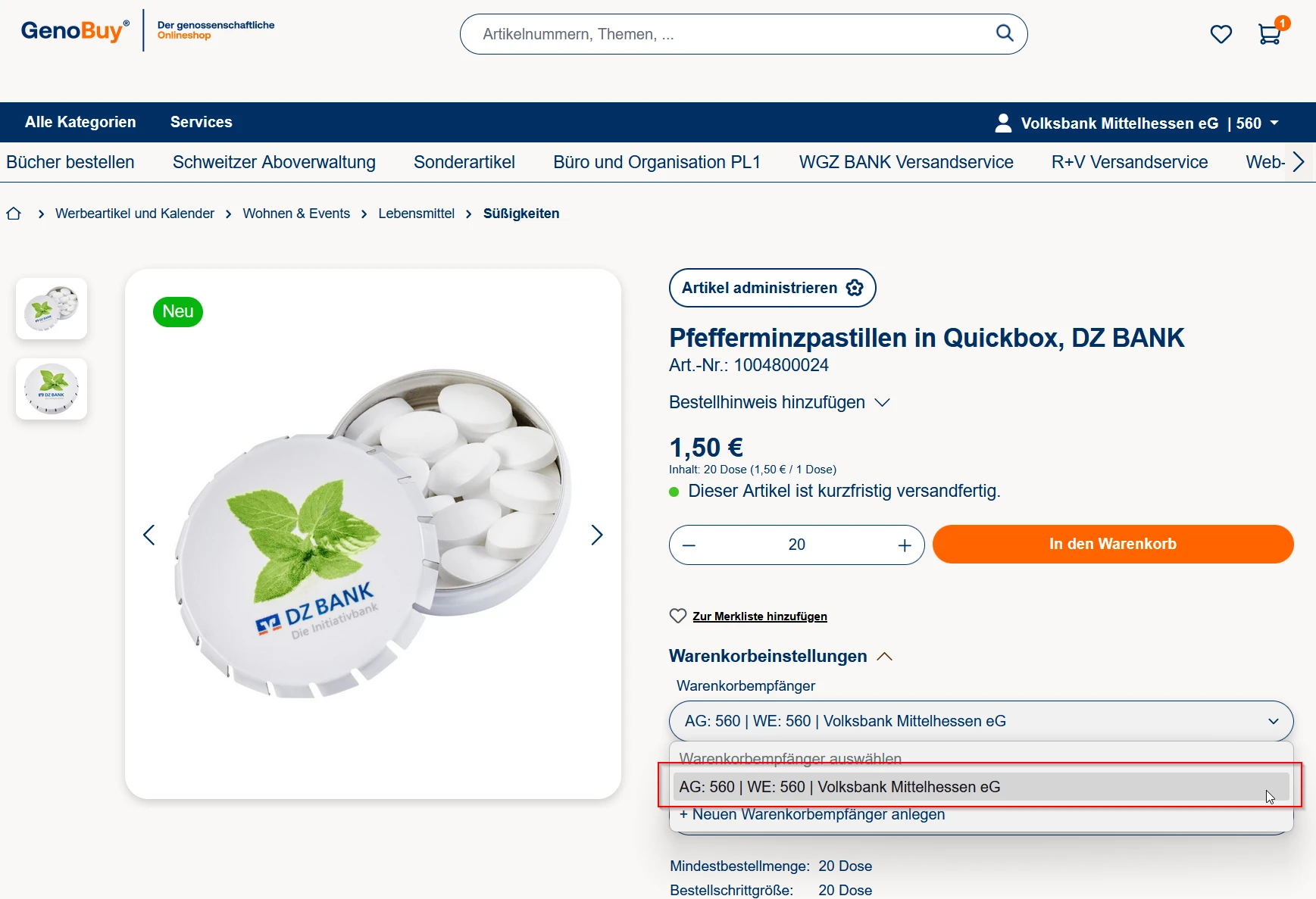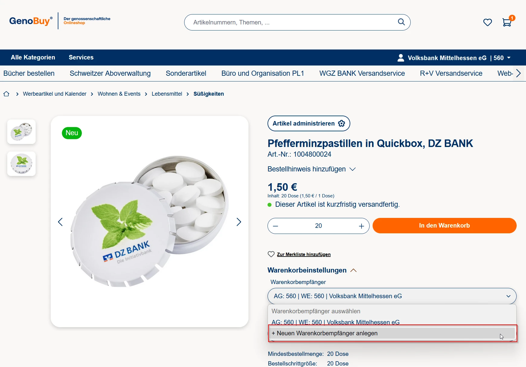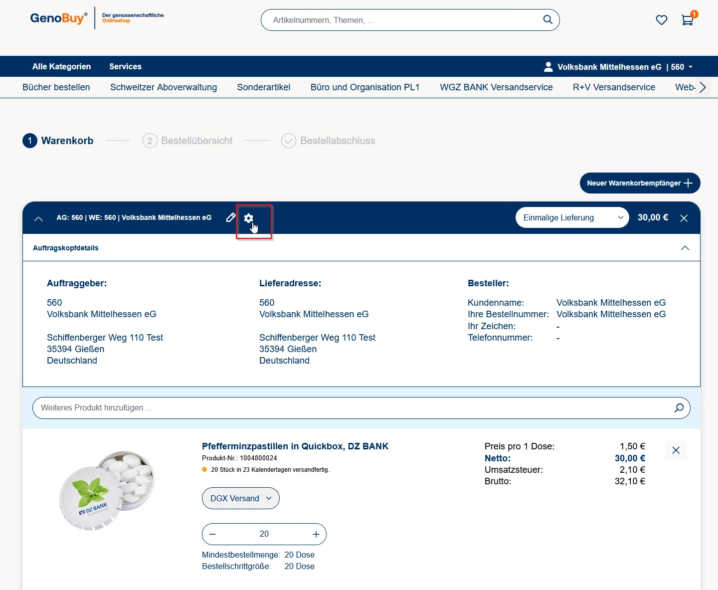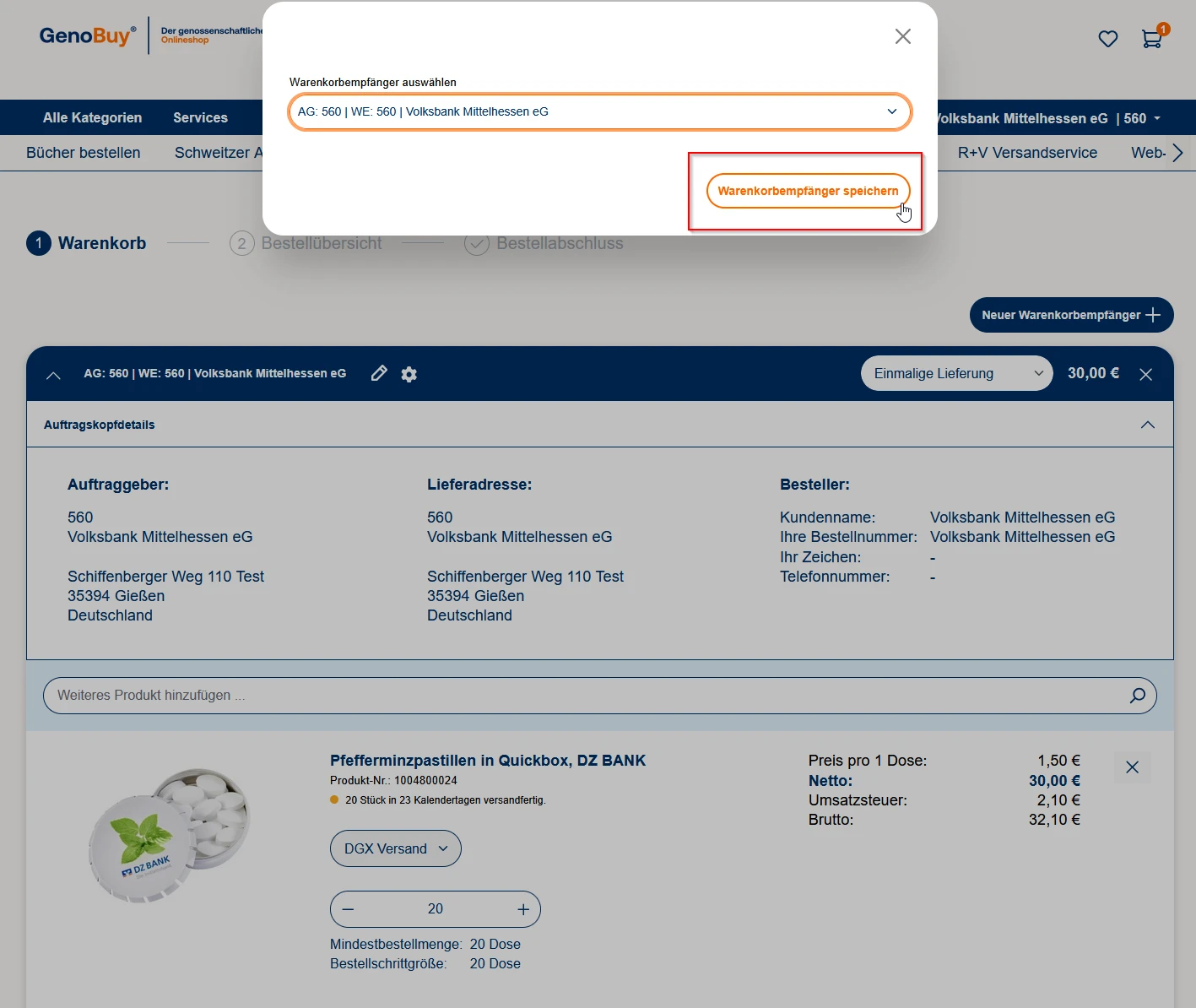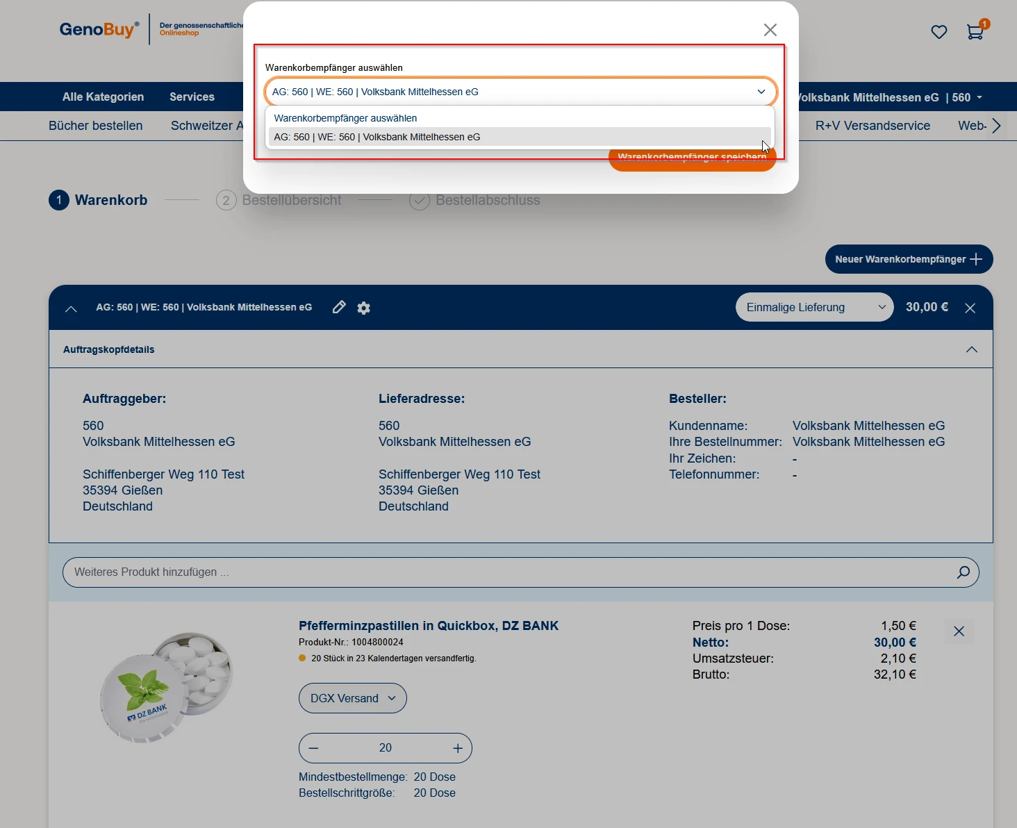 Mit einem Klick auf „Neuen Warenkorbempfänger anlegen“ können Sie außerdem einen neuen Auftragskopf erstellen.