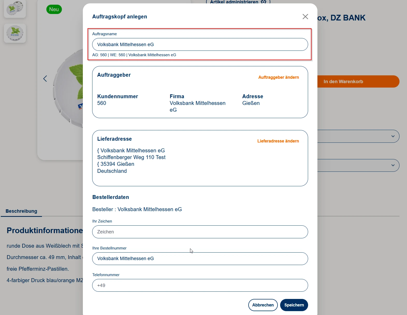 Auftragsname: Auftraggebernummer und Warenkorbempfängernummer des Bestellers im System sowie Kundennamen