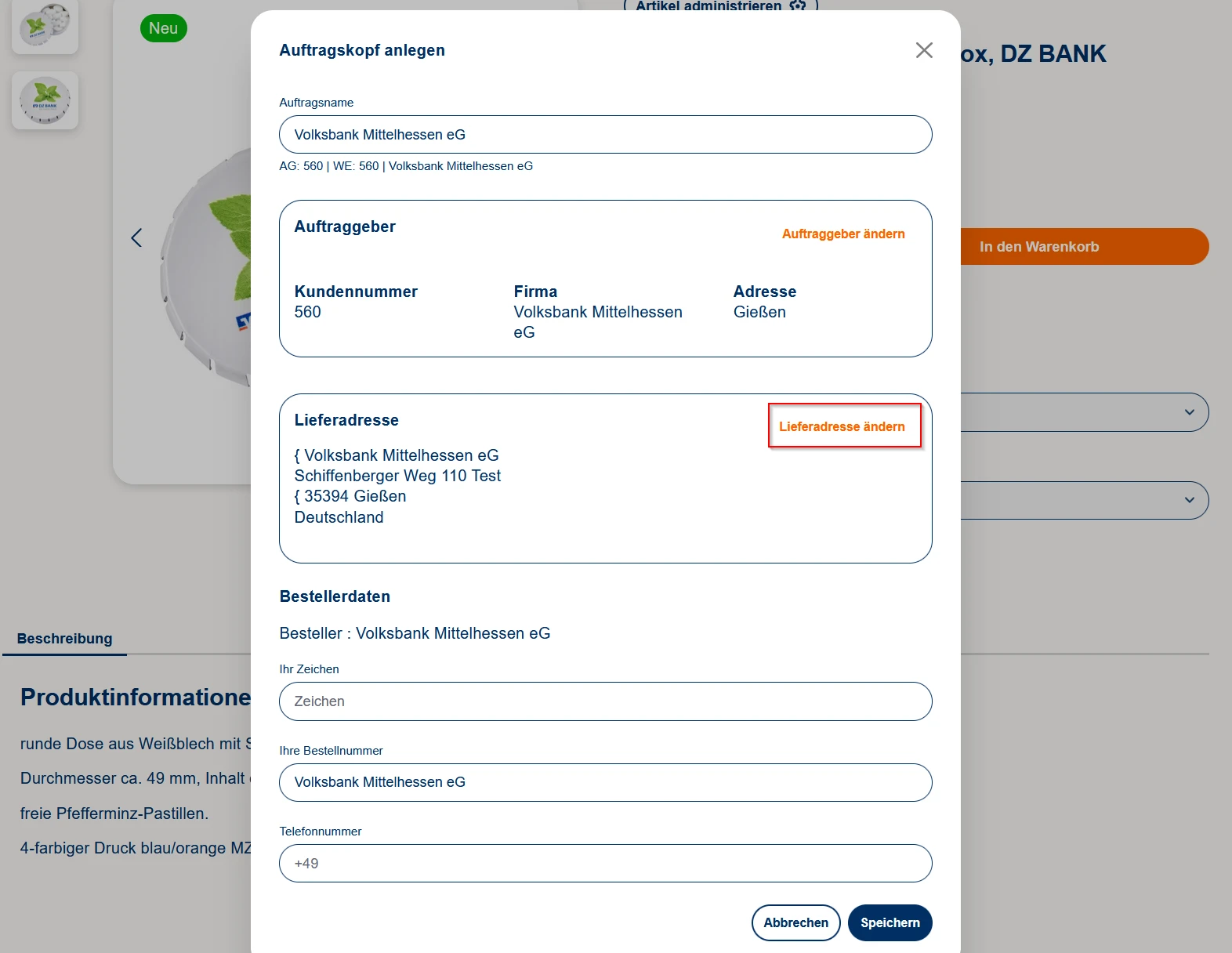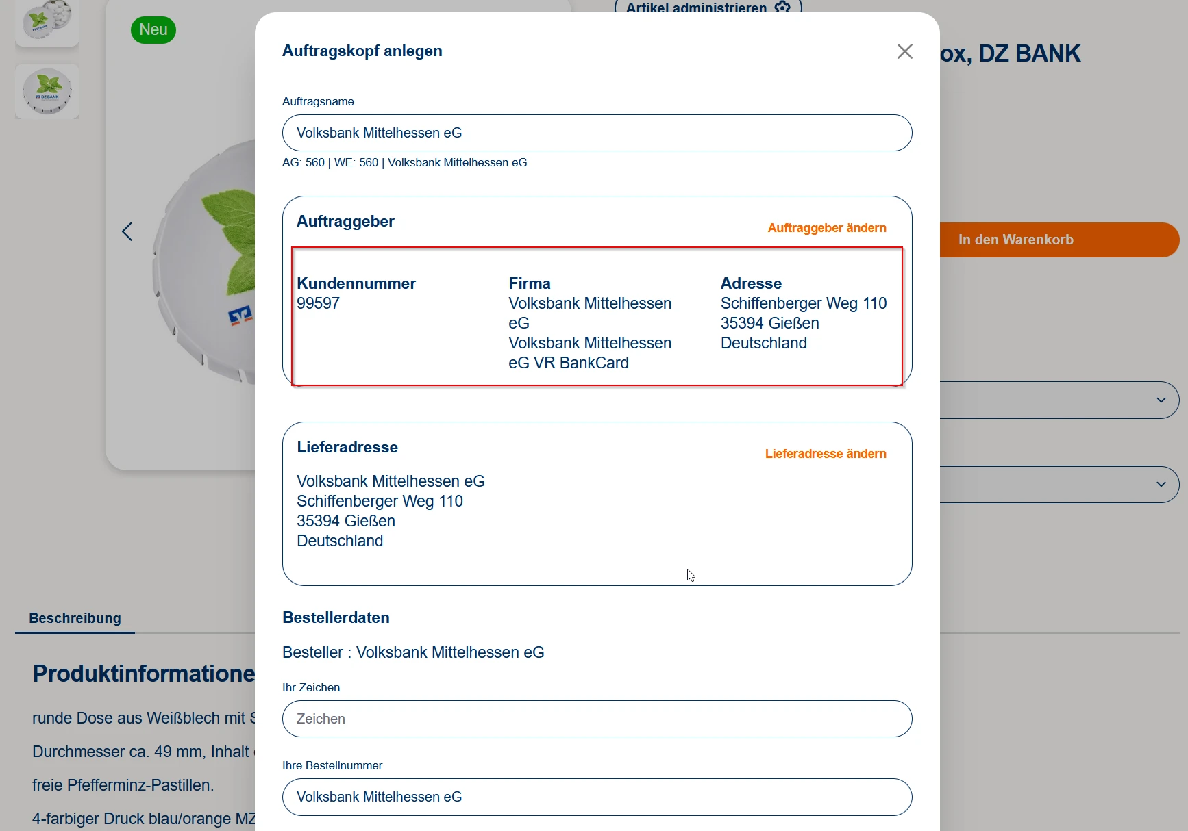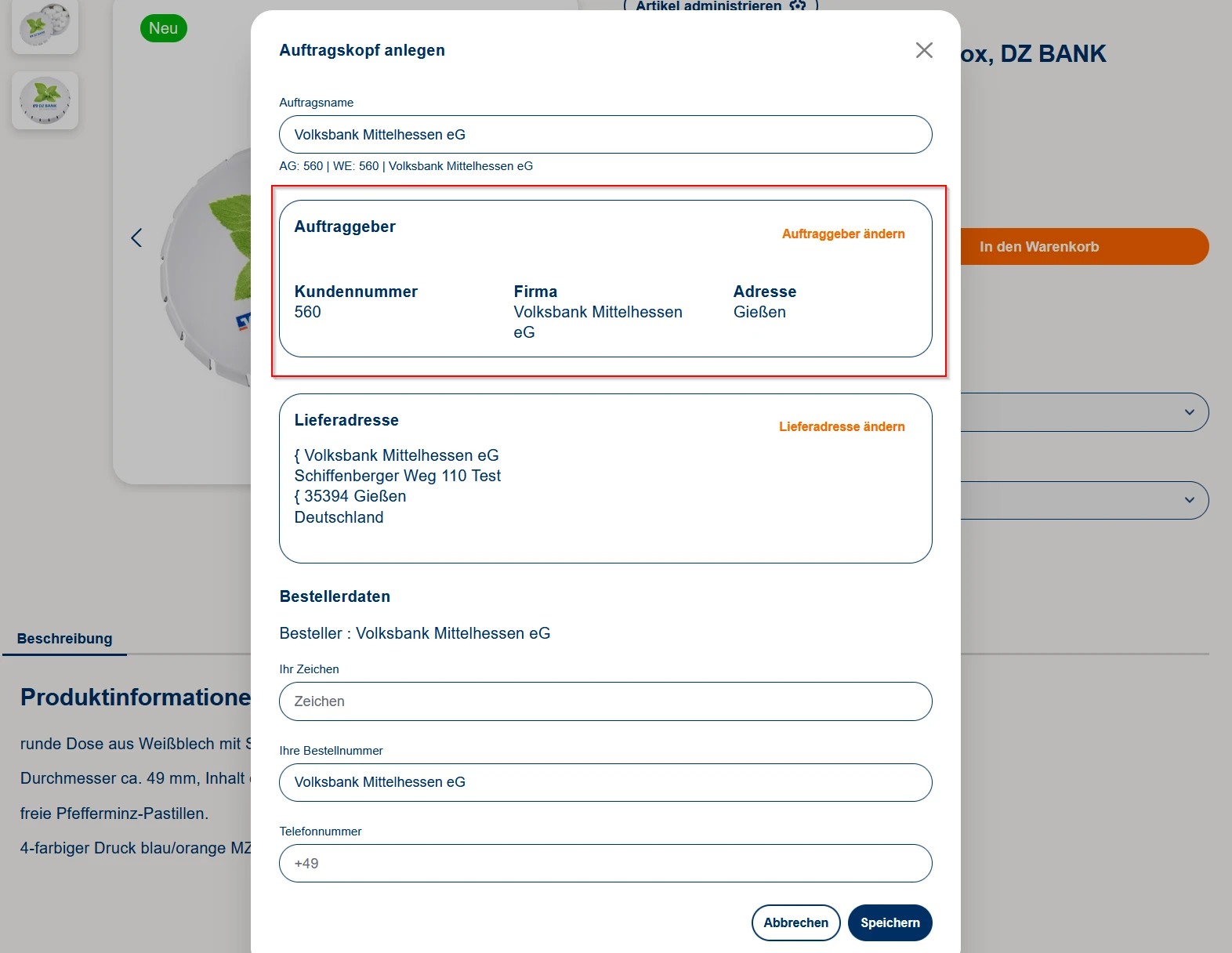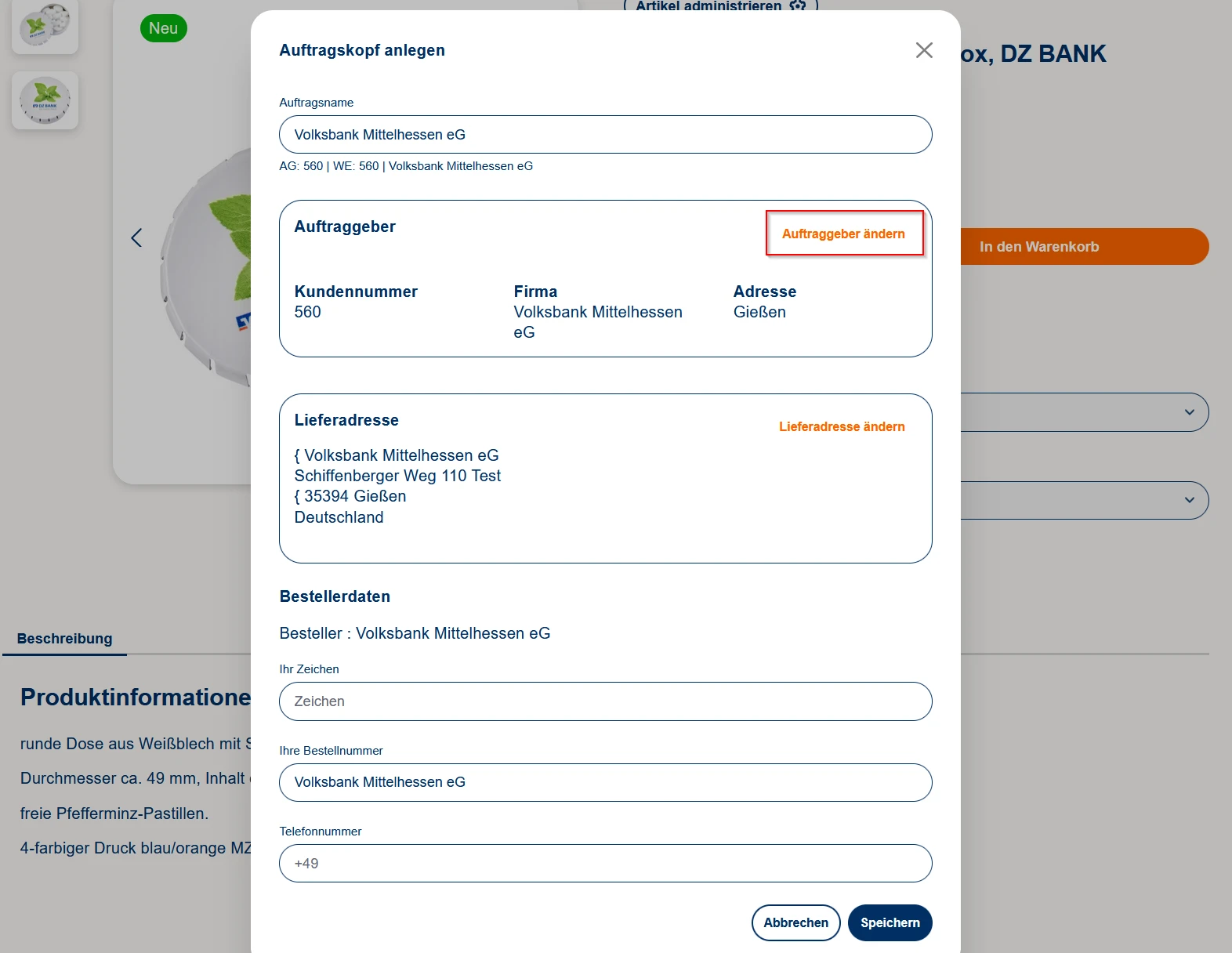 Auftraggeber ändern: durch Klick kann ein anderer Auftraggeber ausgewählt werden (z. B. bei Bestellungen für verschiedene Mandanten oder Standorte)