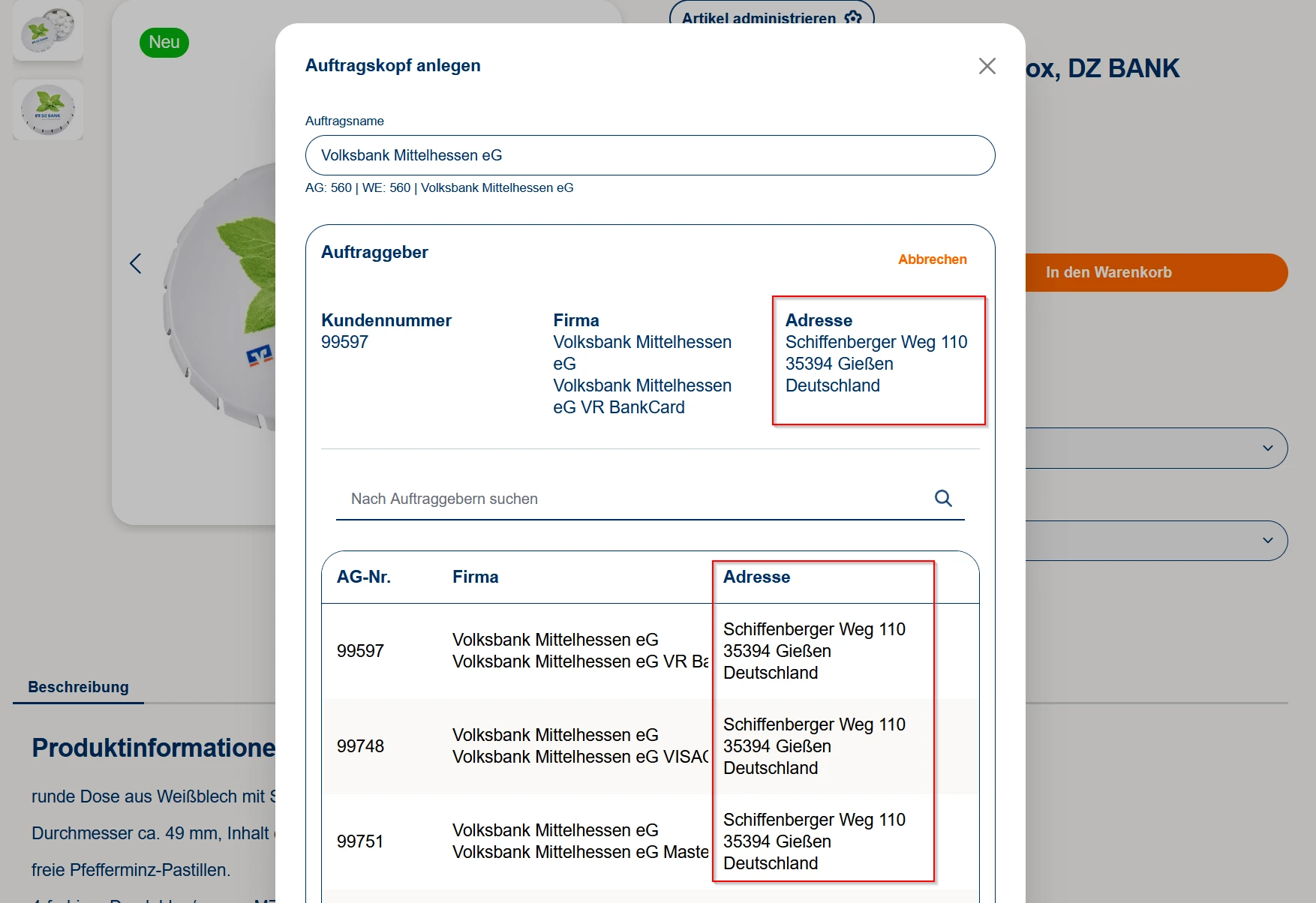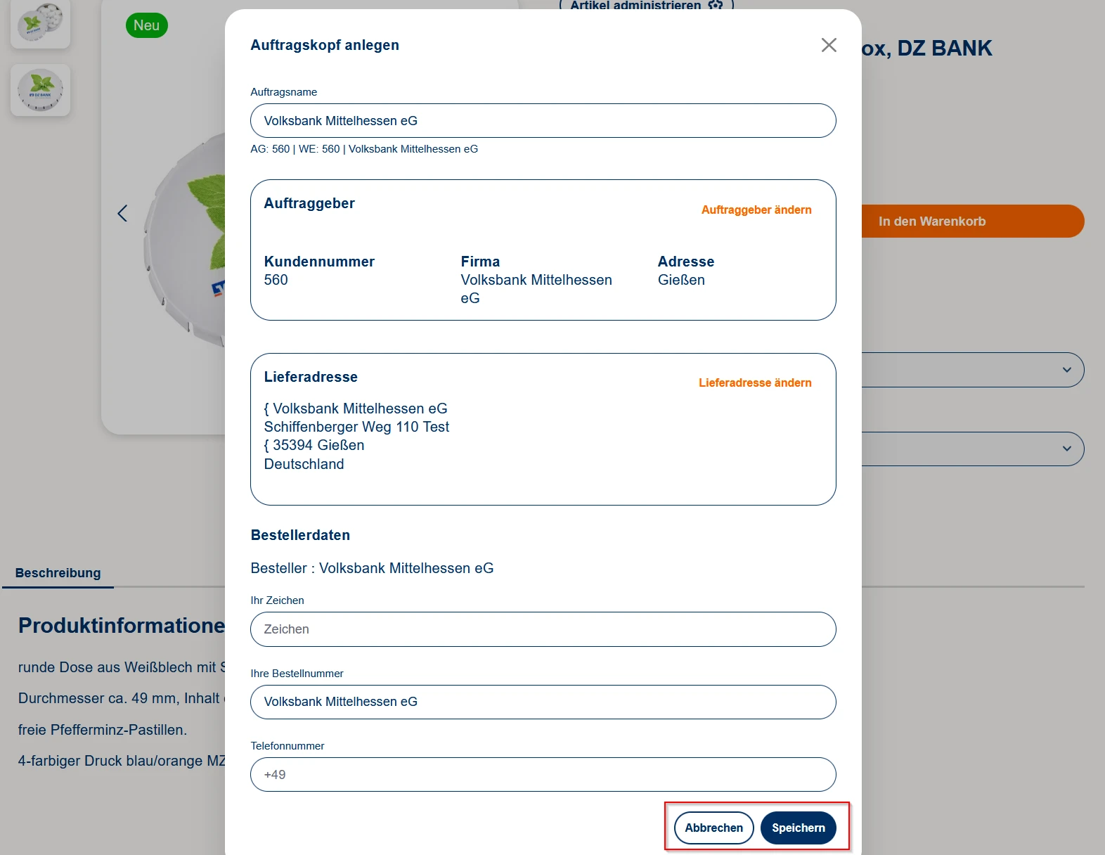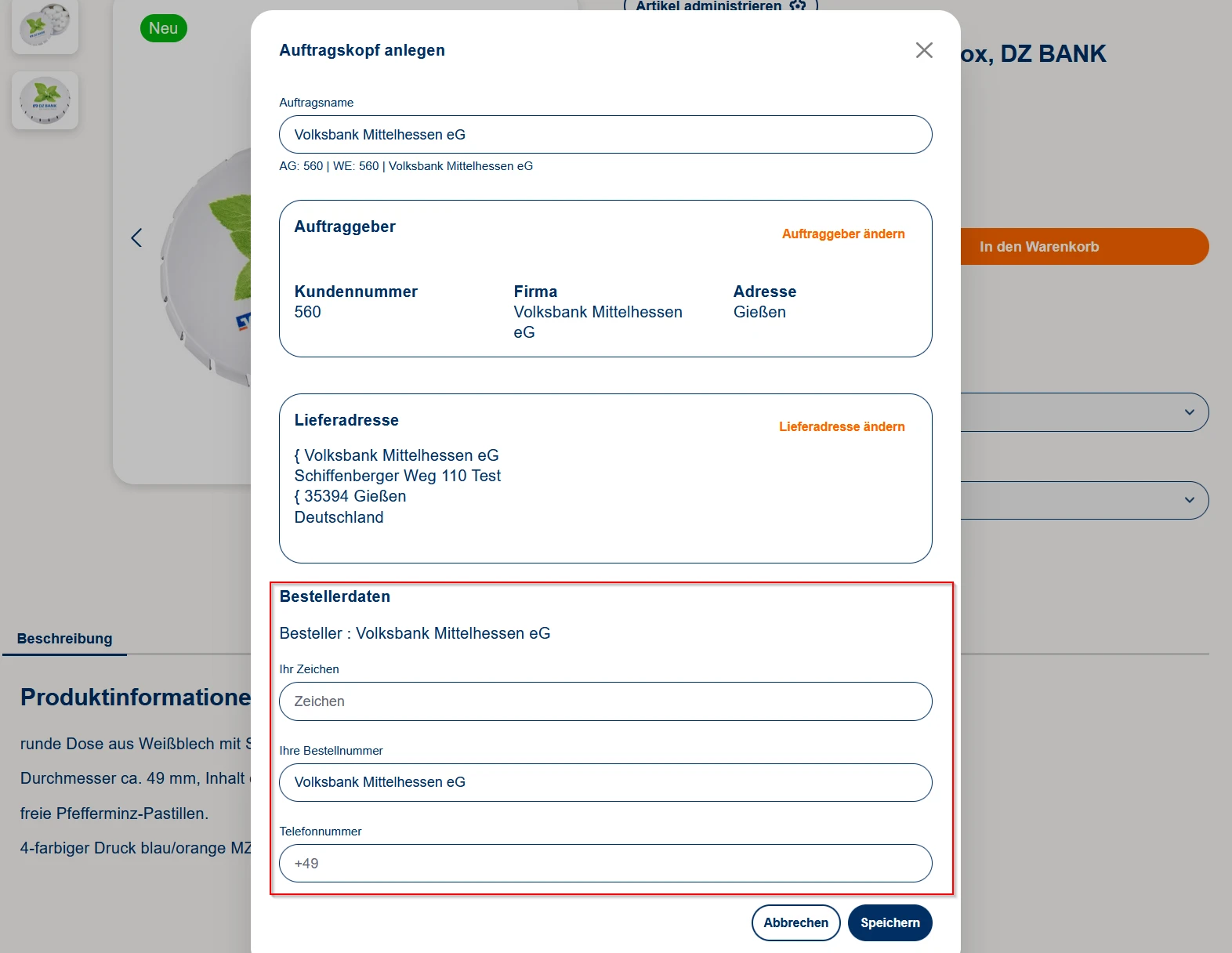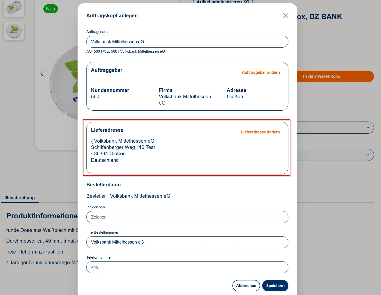 Auftraggeber ändern: durch Klick kann ein anderer Auftraggeber ausgewählt werden (z. B. bei Bestellungen für verschiedene Mandanten oder Standorte)