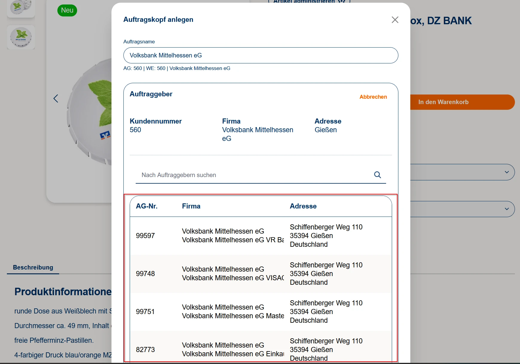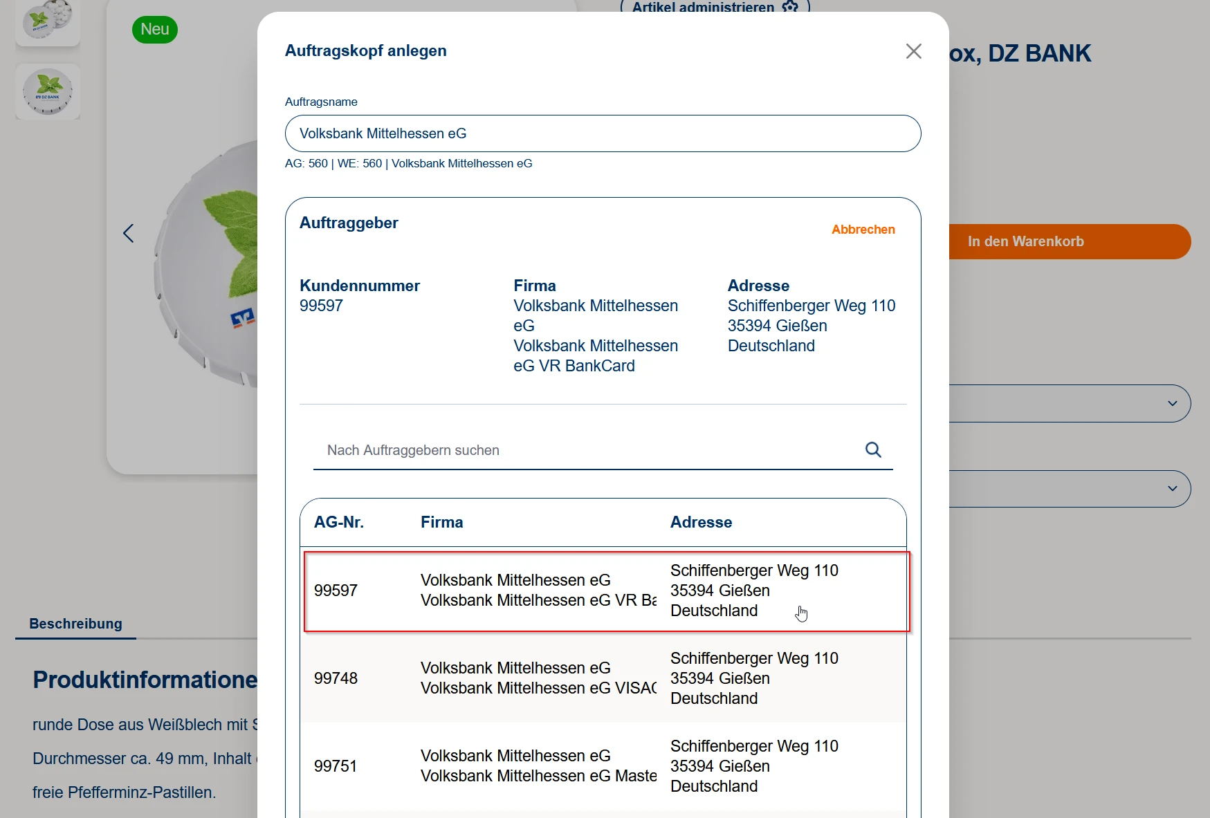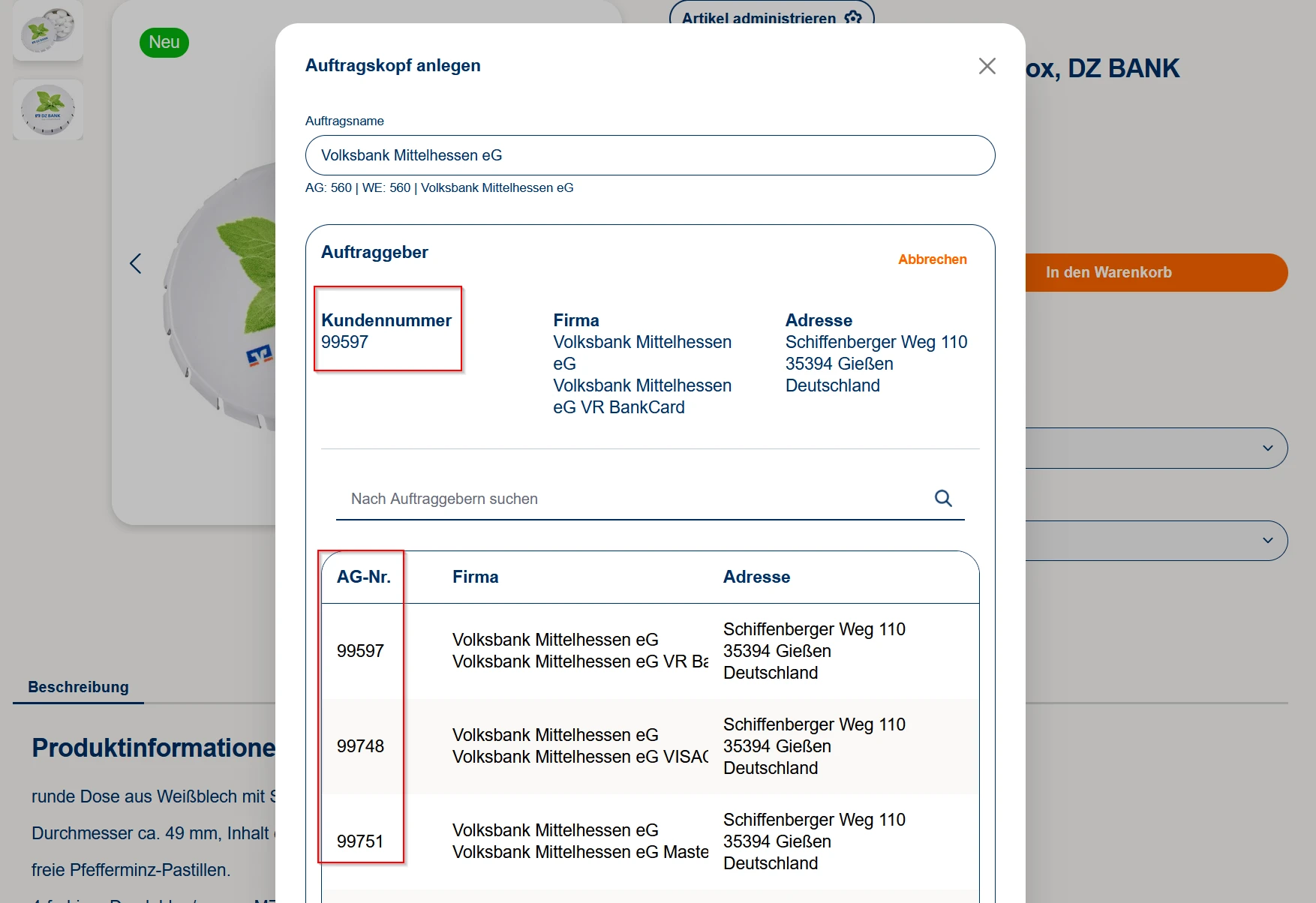Bevor ein Auftrag im GenoBuy erstellt werden kann, muss ein Auftraggeber ausgewählt werden. Dieser Schritt legt fest, unter welchem Kundenkonto (Auftraggebernummer, Firma, Adresse) der Auftrag läuft.