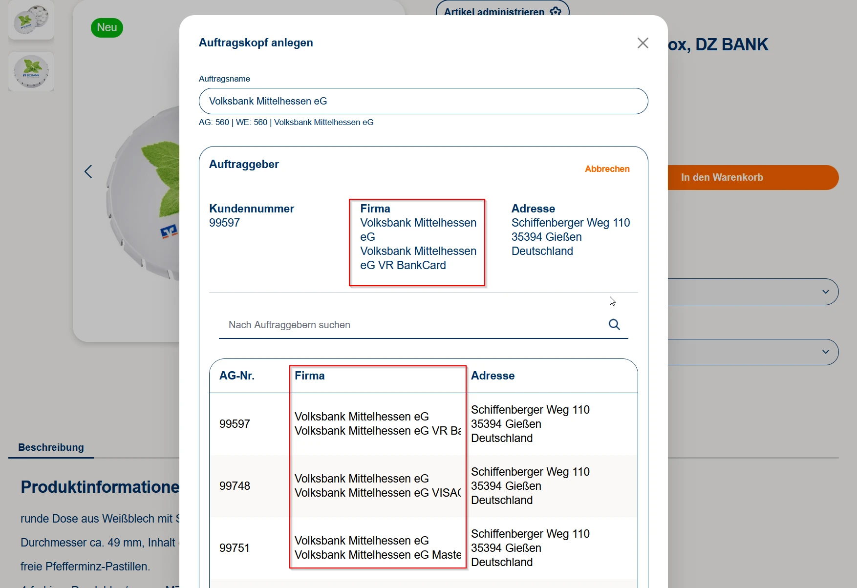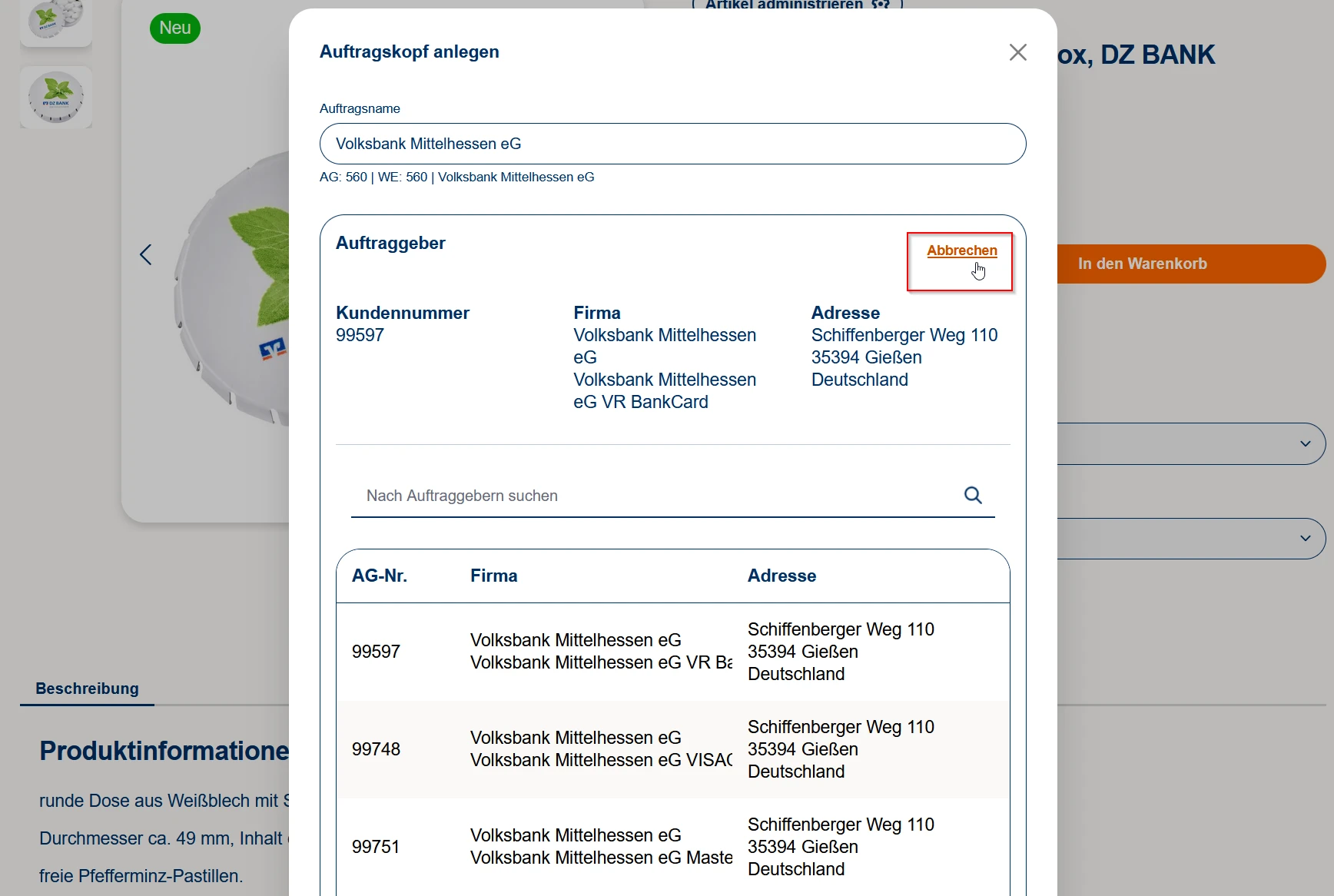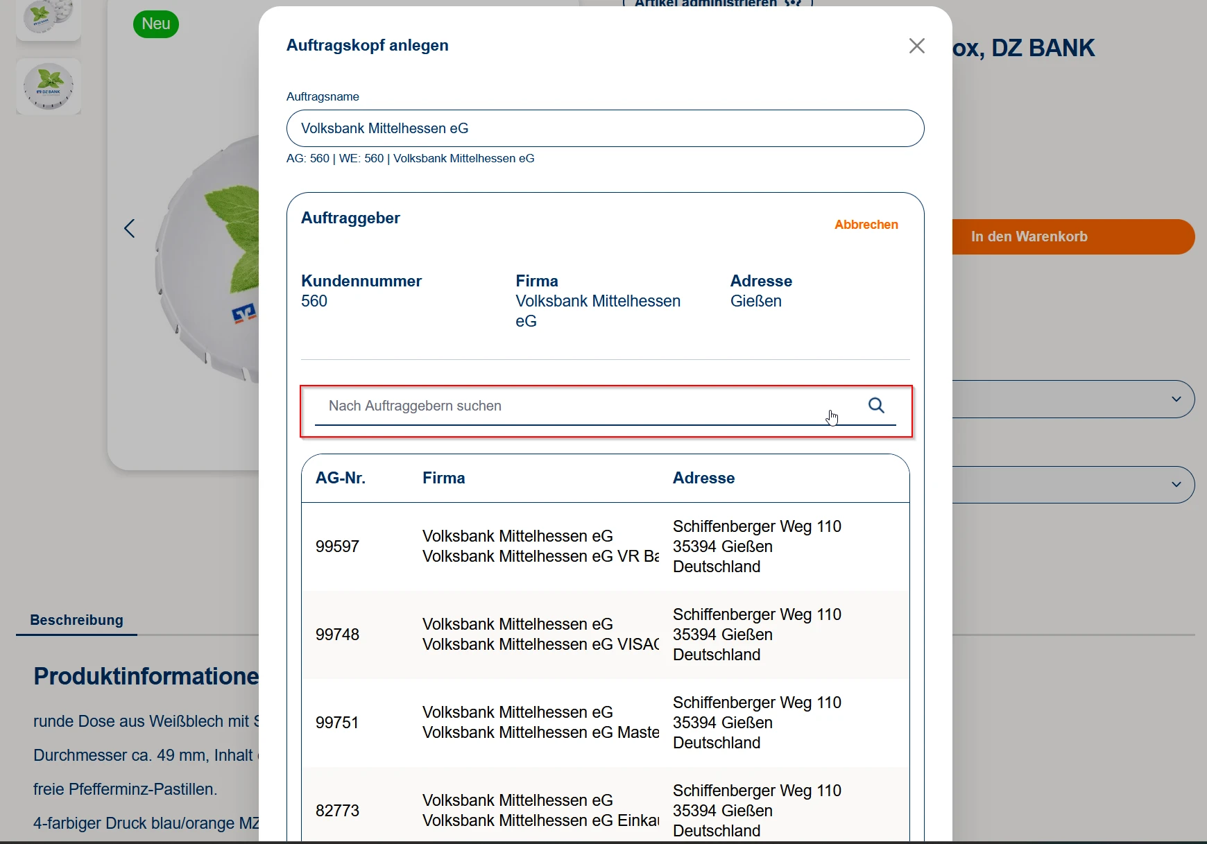 Bevor ein Auftrag im GenoBuy erstellt werden kann, muss ein Auftraggeber ausgewählt werden. Dieser Schritt legt fest, unter welchem Kundenkonto (Auftraggebernummer, Firma, Adresse) der Auftrag läuft.