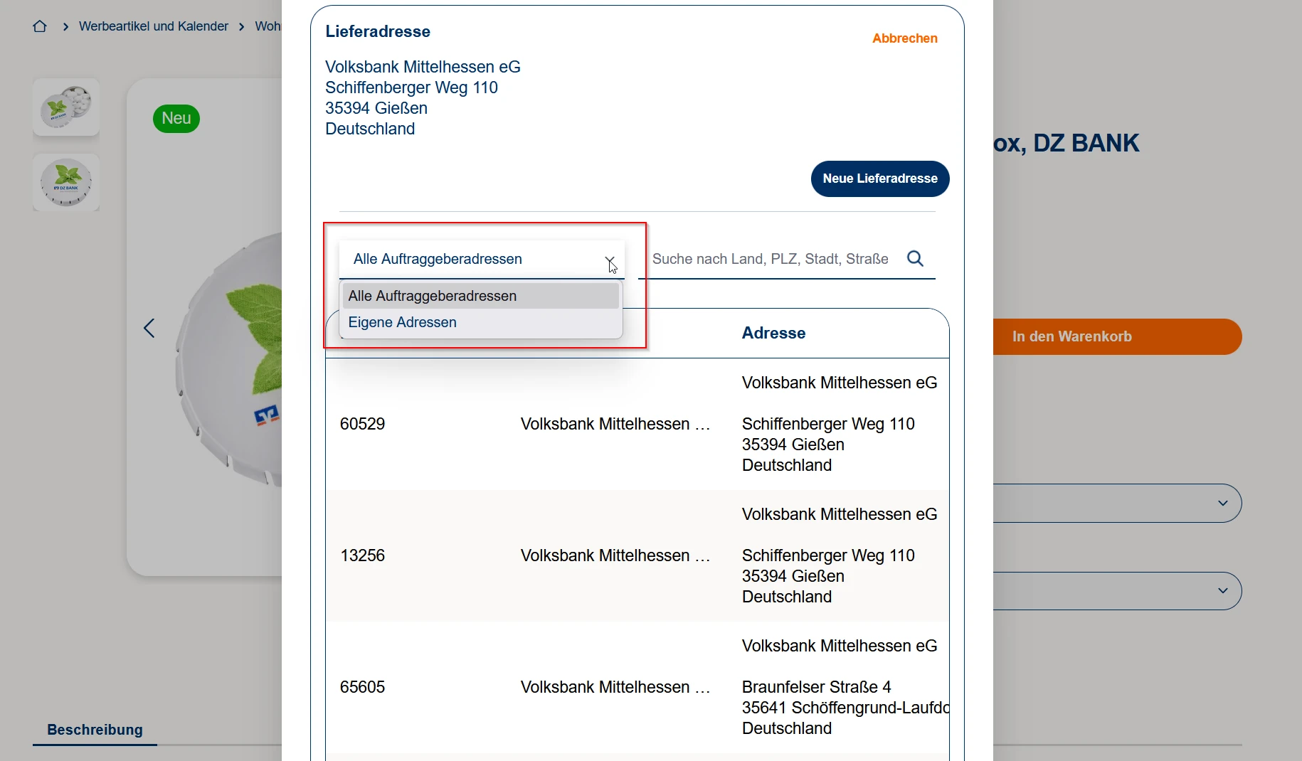 Dropdown-Menü: Filtermöglichkeiten nach bestimmten Adresskategorien (z.B. Eigene Lieferadressen)