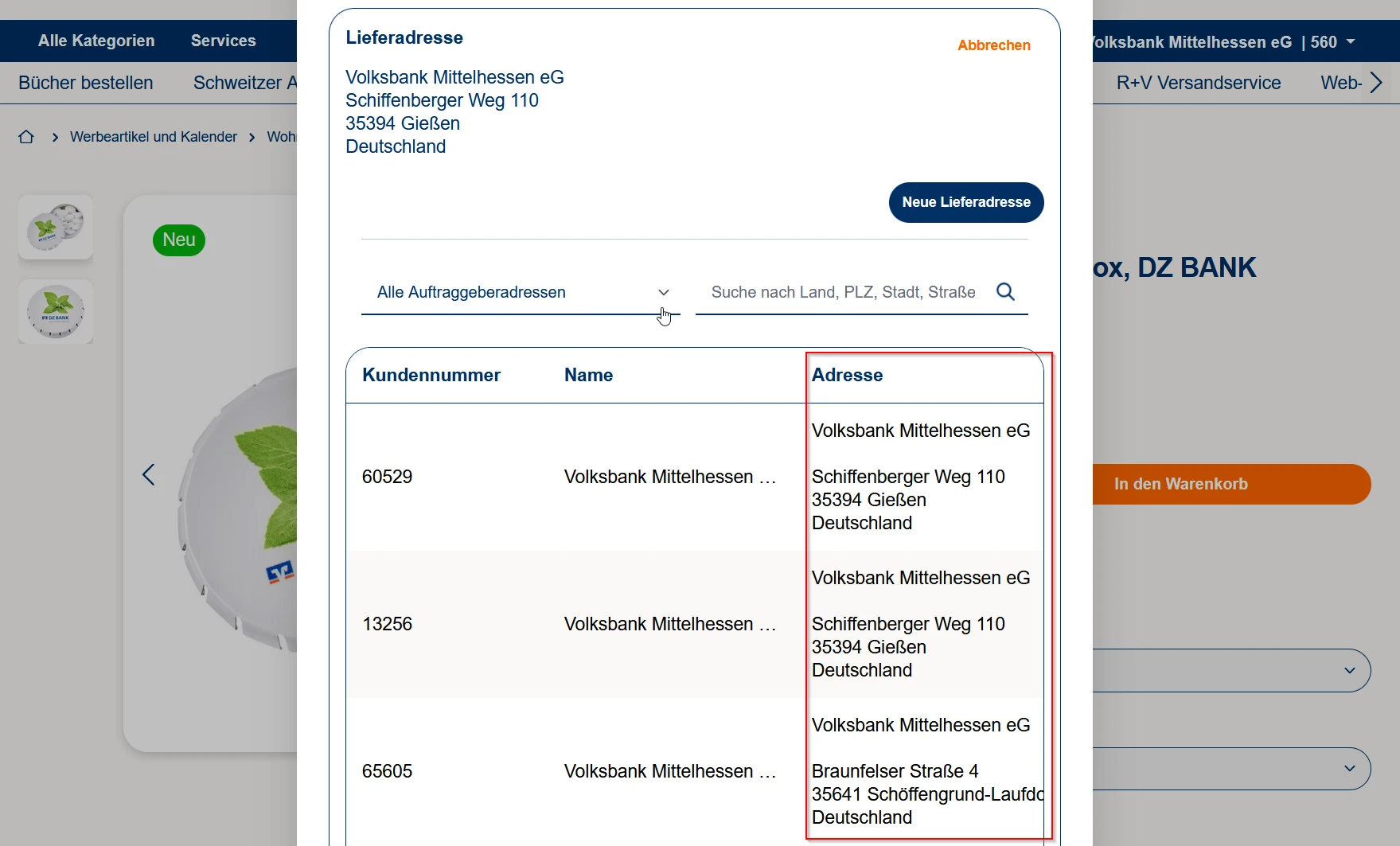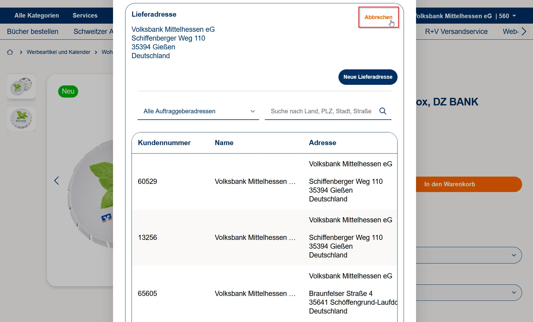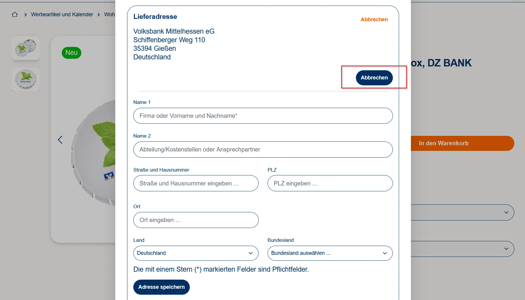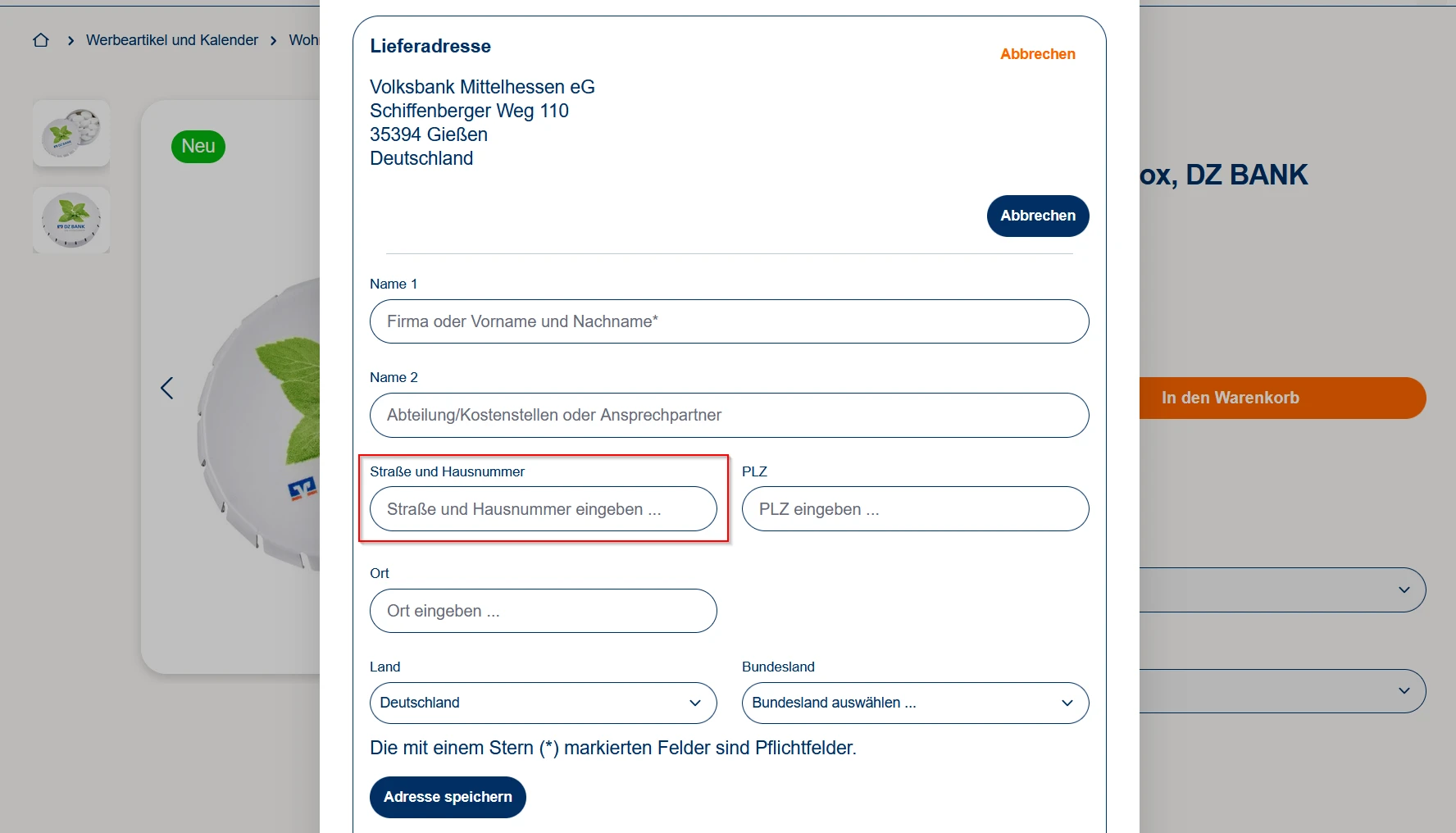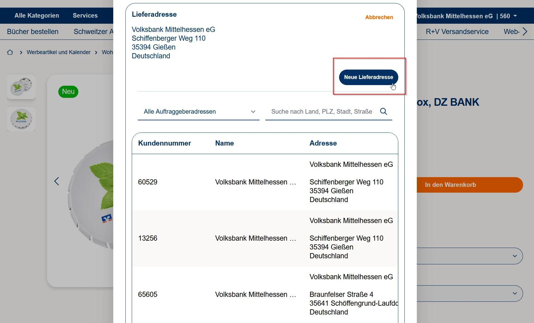 Neue Lieferadresse: öffnet ein Formular zur Eingabe einer neuen Adresse, falls keine passende Lieferadresse vorhanden ist
