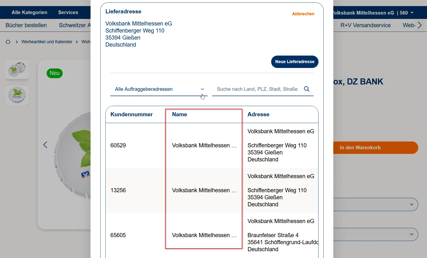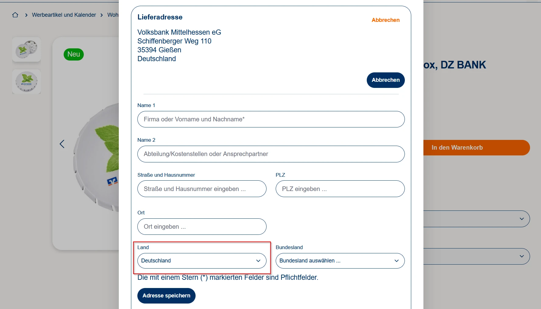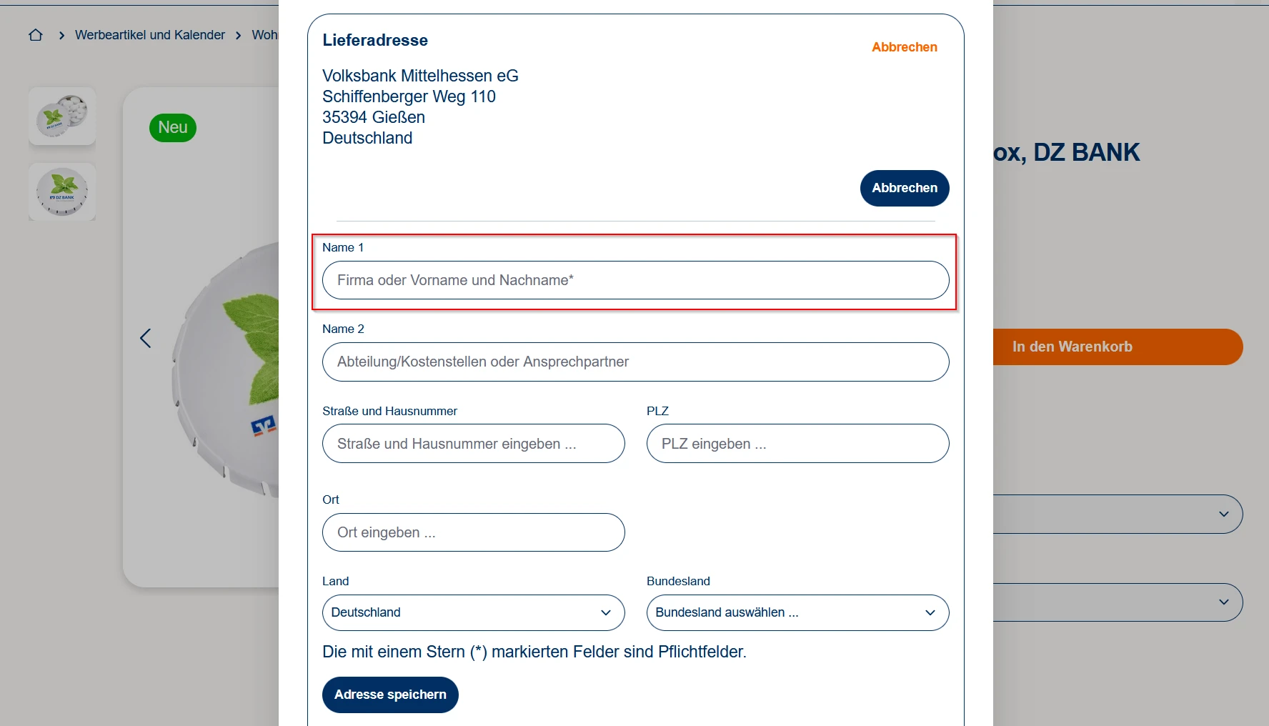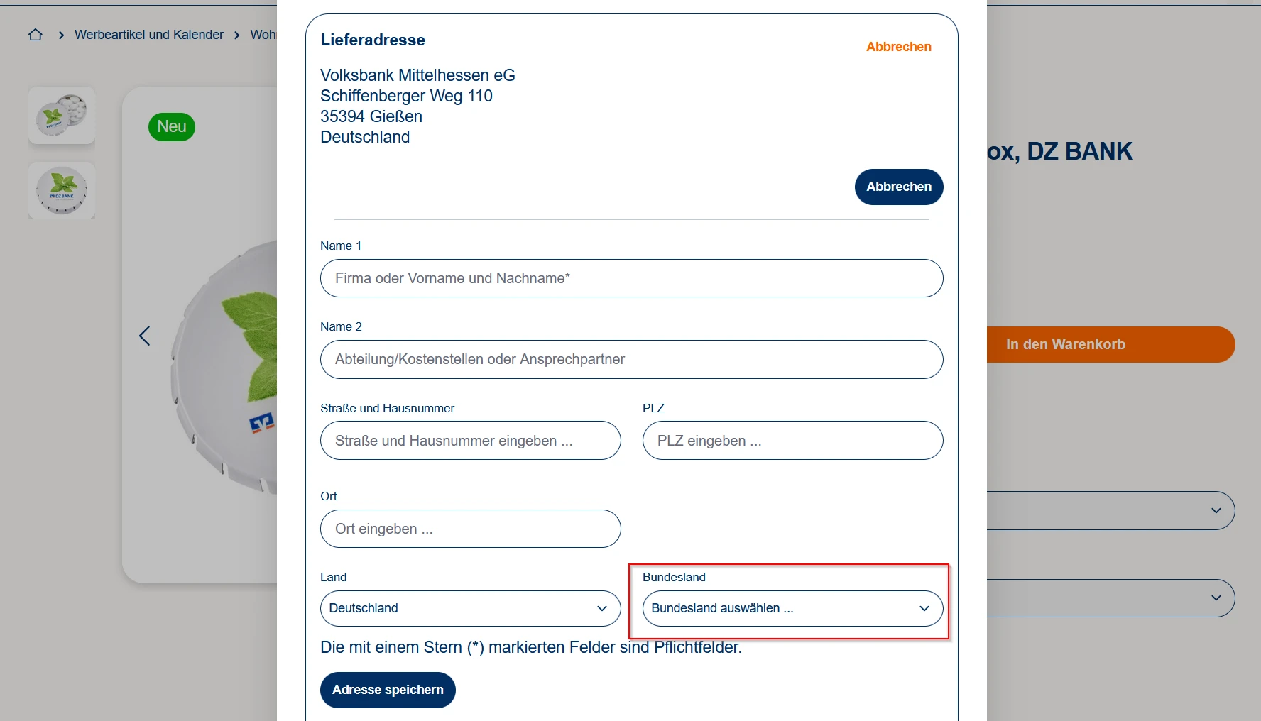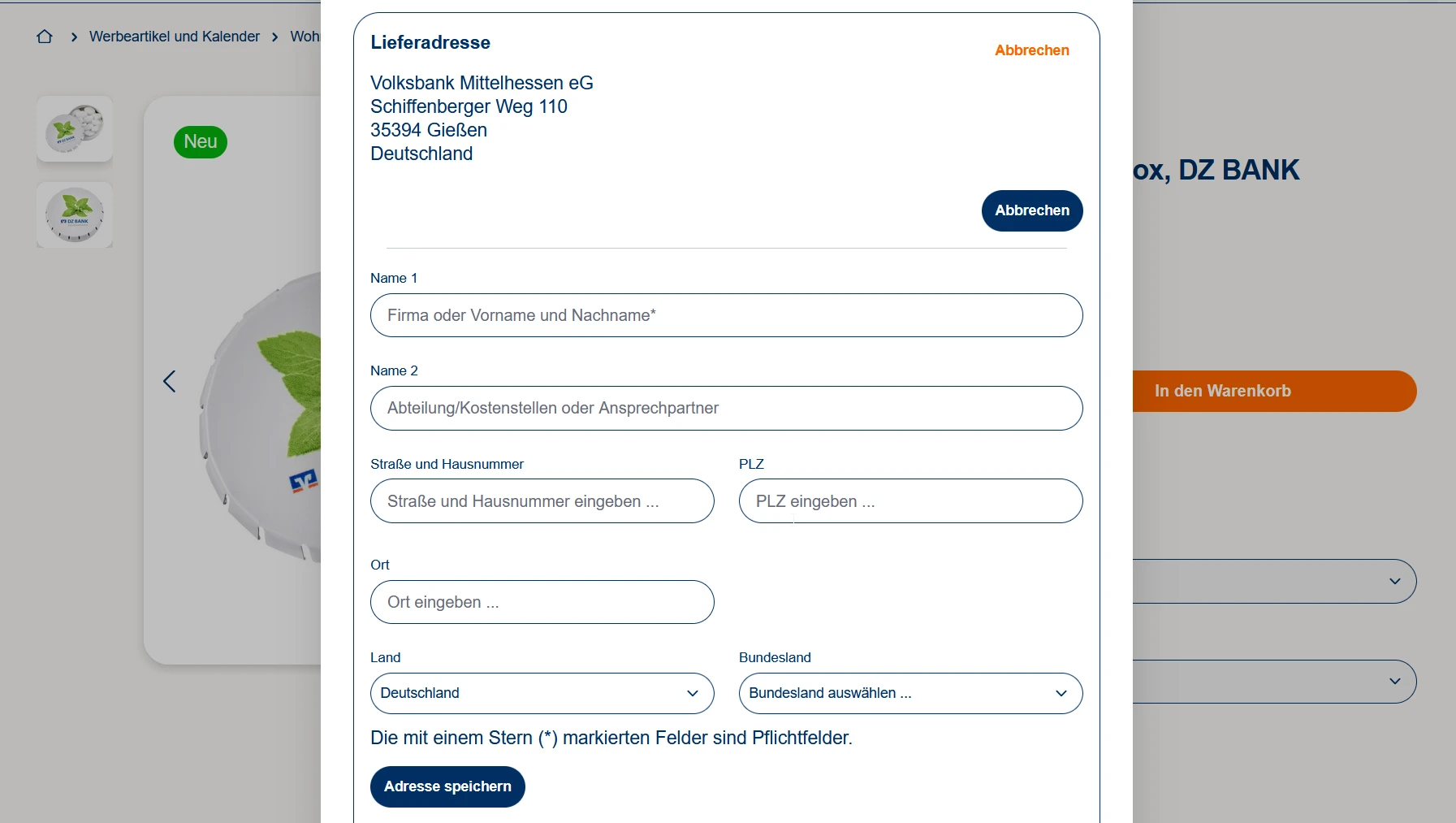 Neue Lieferadresse: öffnet ein Formular zur Eingabe einer neuen Adresse, falls keine passende Lieferadresse vorhanden ist