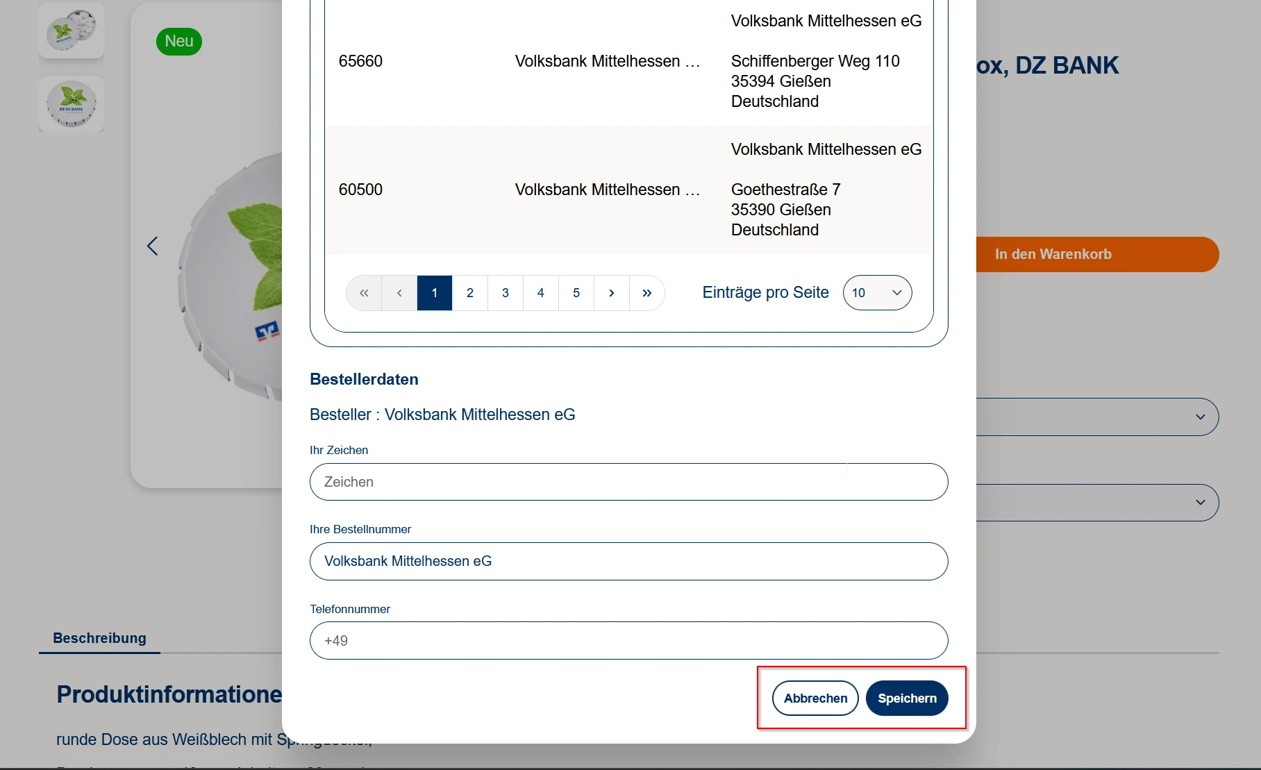 Nachdem Sie die Auftragsdaten eingegeben und gespeichert haben, können Sie den neu angelegten Auftragskopf über einen Klick auf das Zahnrad im Dropdown „Warenkorbempfänger auswählen“ auswählen. Bestätigen Sie anschließend Ihre Auswahl mit einem Klick auf den Button „Warenkorbempfänger speichern“.