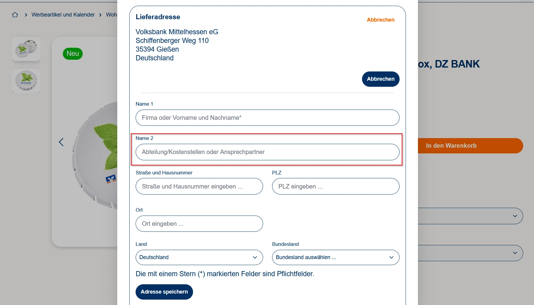 Name 2: optionale Angabe von Abteilung, Kostenstelle oder Ansprechpartner