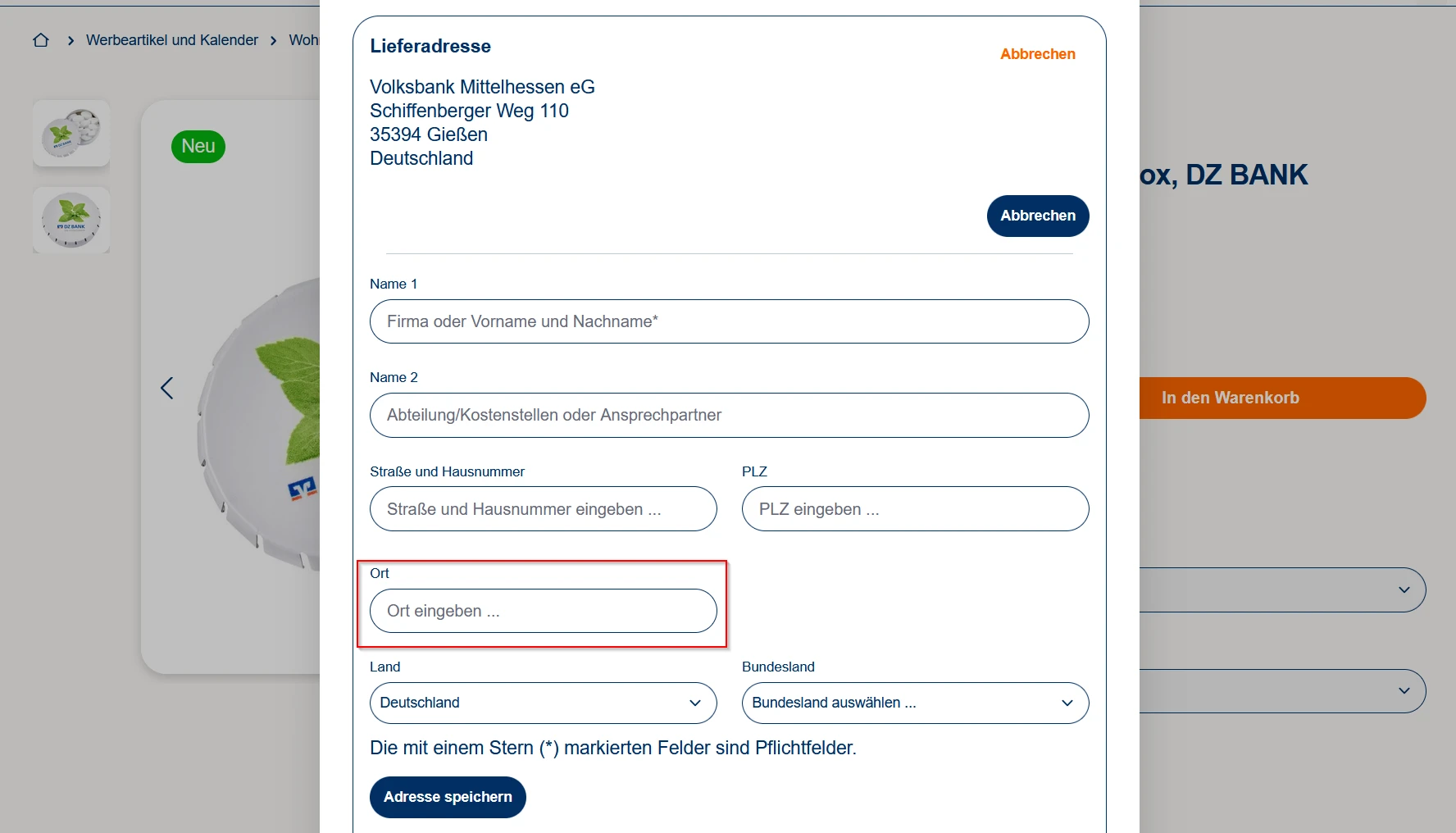 Im folgenden Formular müssen alle relevanten Informationen zur Lieferadresse eingegeben werden.