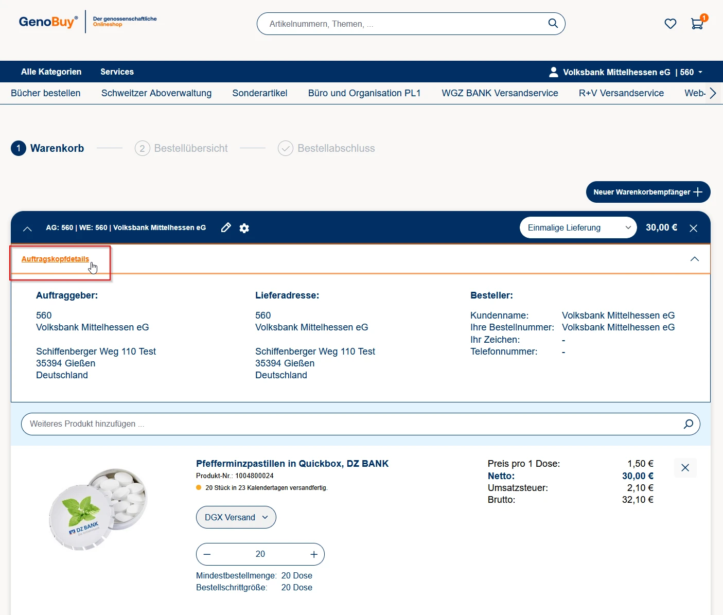 Im Warenkorb kann der Auftragskopf geprüft und neu angelegt werden. Nach dem Klick auf den Button „Auftragskopfdetails“ werden die Einzelheiten der Auftragskopfes angezeigt.