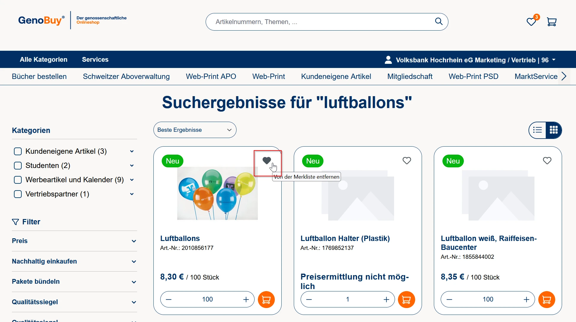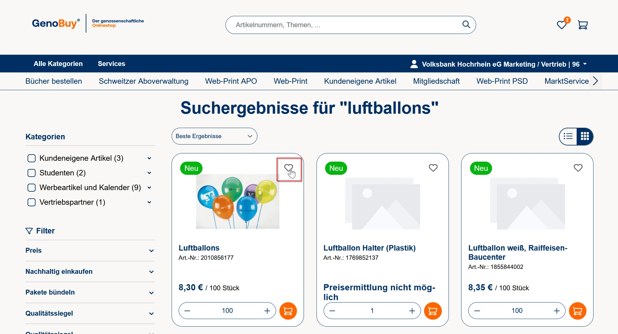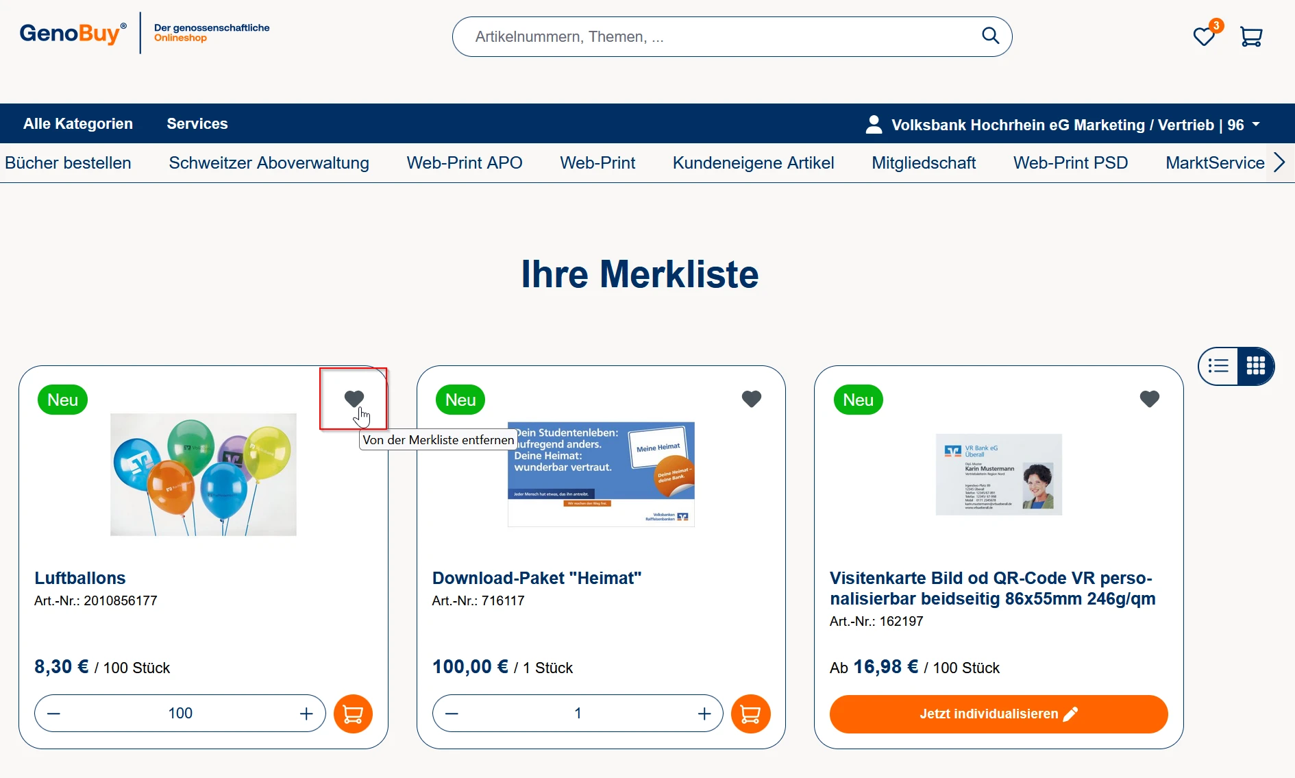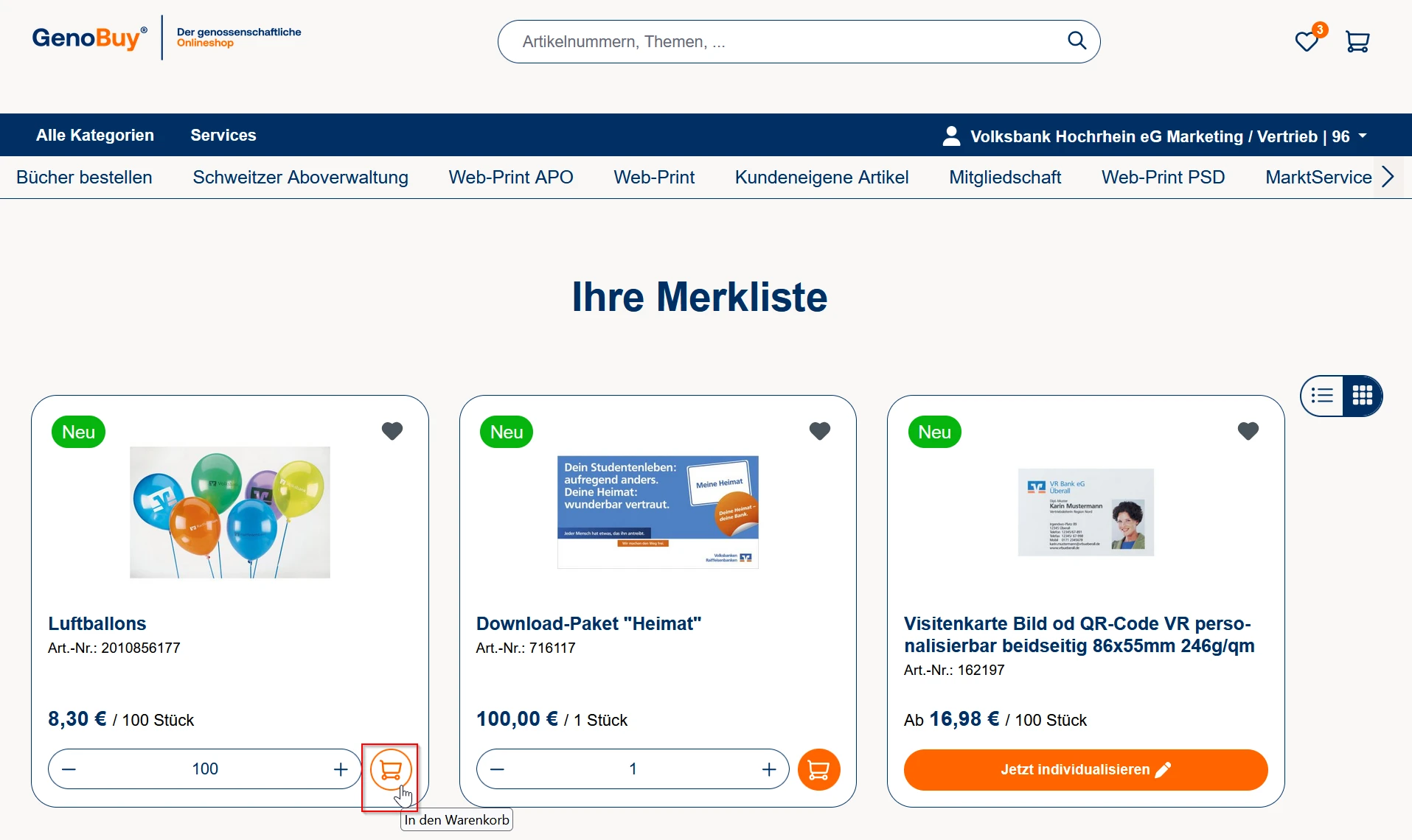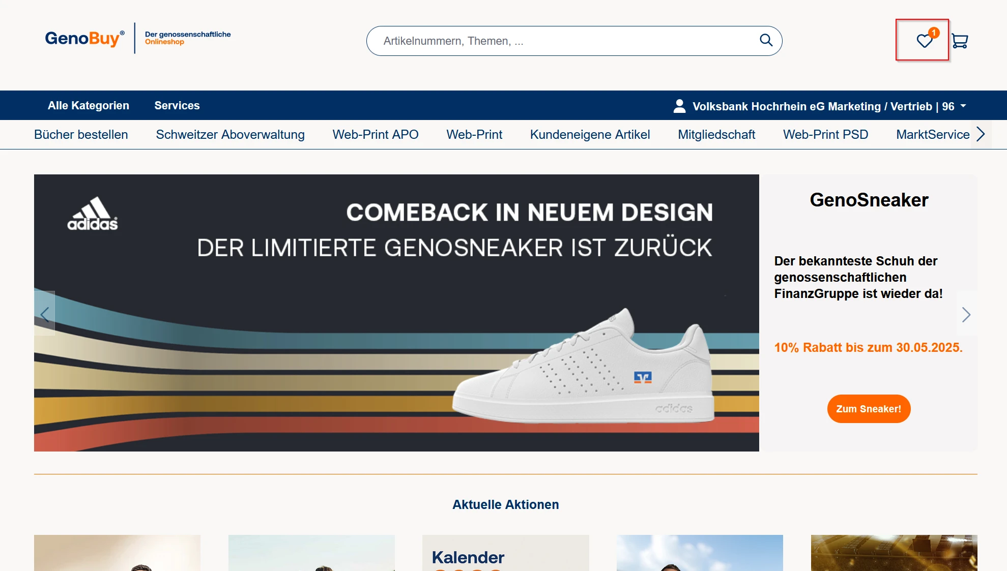 Nach erfolgreichem Login in GenoBuy klicken Sie auf das Herz-Symbol, um zur Merkliste zu gelangen.
