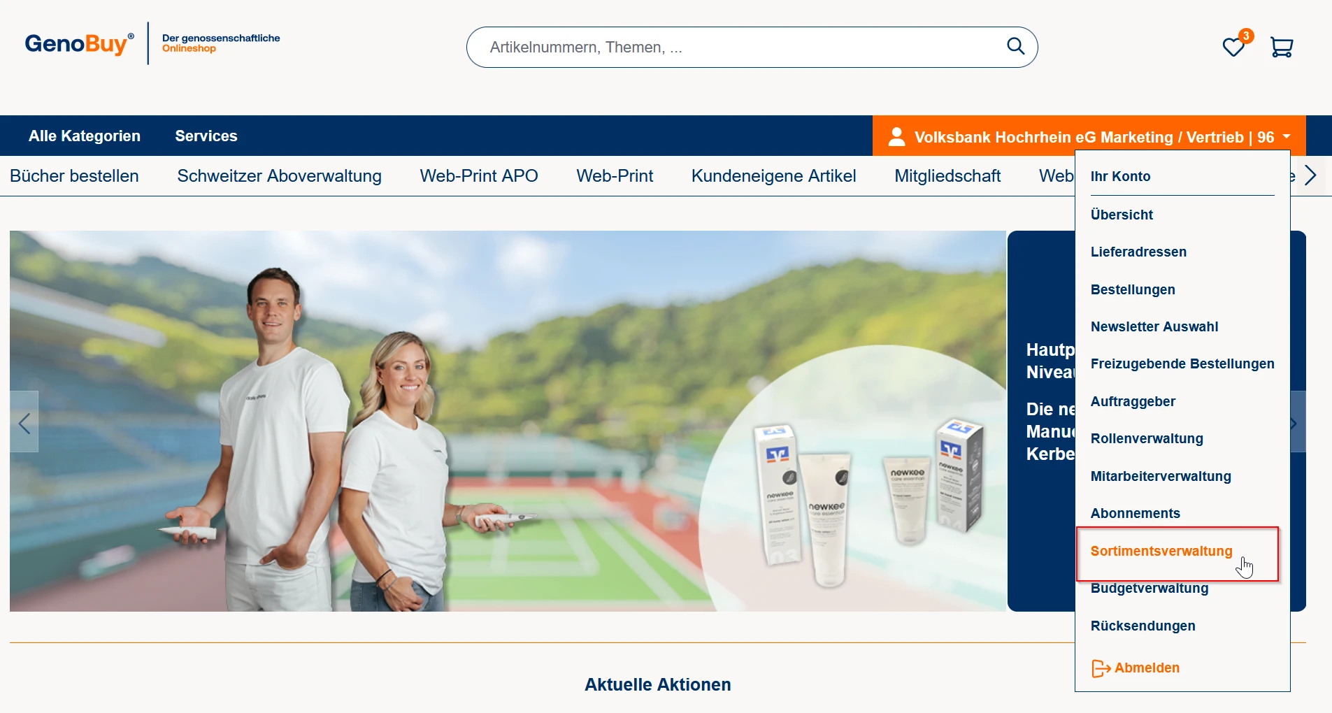 Je nach Berechtigung kann die Sortimentsverwaltung über "Ihr Konto" → "Sortimentsverwaltung" aufgerufen werden. Hierfür muss Ihre Rolle der Rechtegruppe "Konzernrecht" zugeordnet sein.