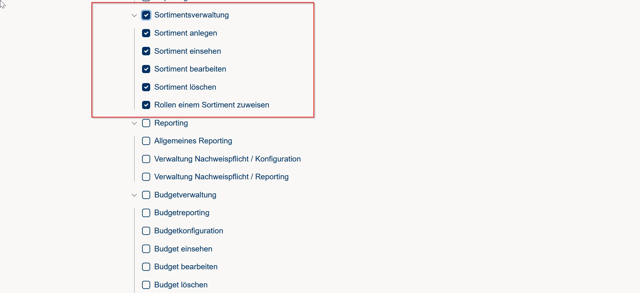 Damit alle Funktionen nutzbar sind, müssen alle Rechte der Sortimentsverwaltung vorhanden sein, ansonsten sind die Funktionen eingeschränkt verfügbar. Siehe Kapitel Rollenverwaltung.