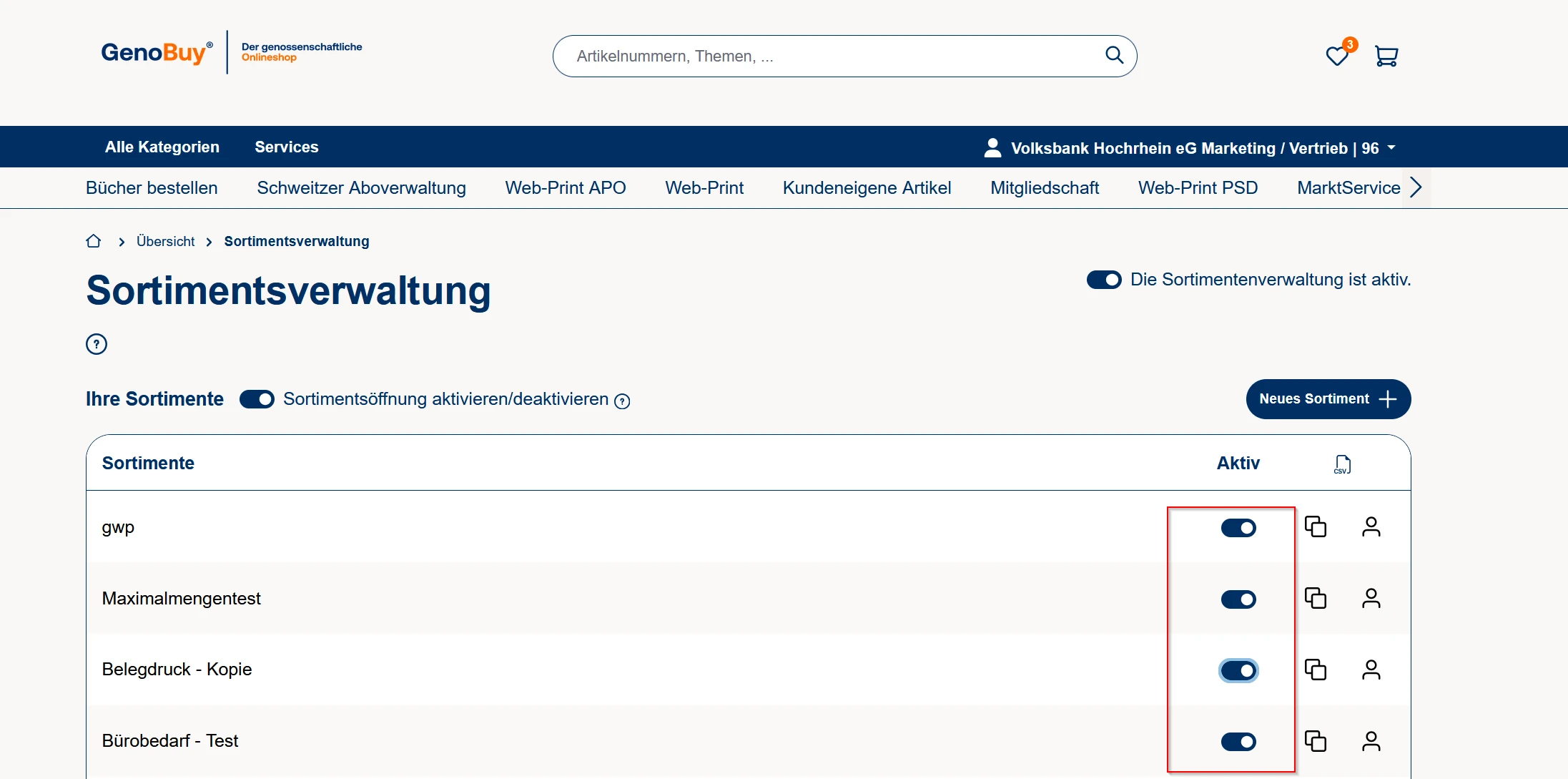 Erst wenn der Schieberegler der Sortimentsverwaltung aktiv ist, greifen die Einstellungen für den Konzern. Somit können alle Einstellungen der Sortimente vorab vorbereitet werden, bevor diese für weitere Rollen in der Sortimentslisten sichtbar sind. Solange der Schieberegler der Sortimentsverwaltung deaktiviert ist, sehen die Rollen das gesamte Sortiment.