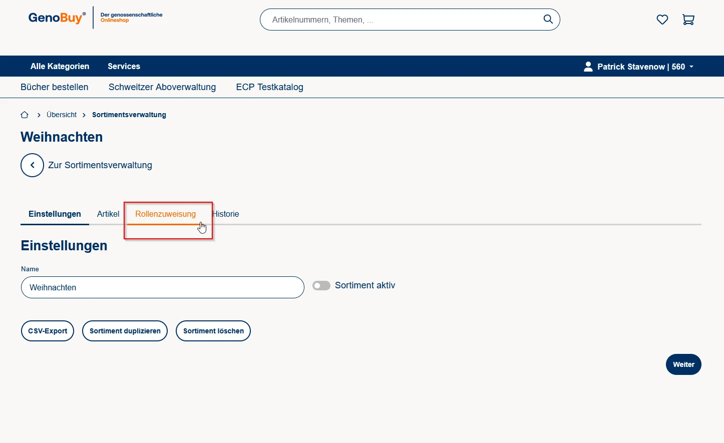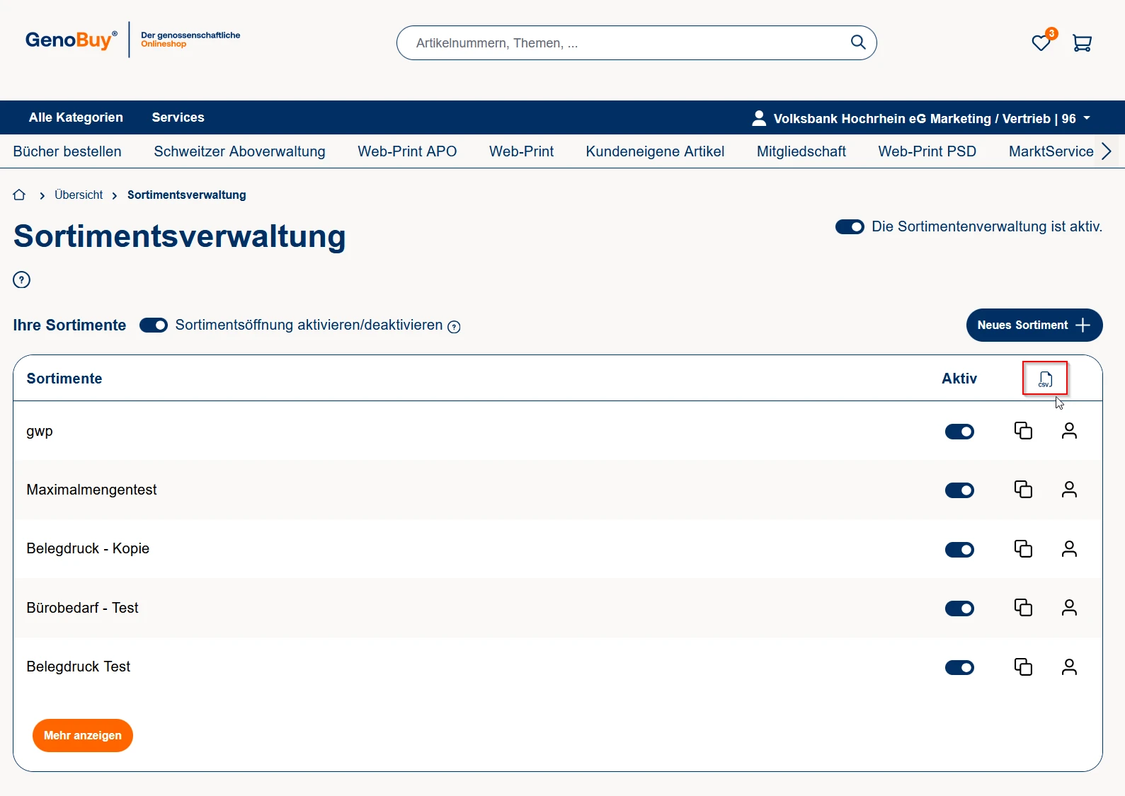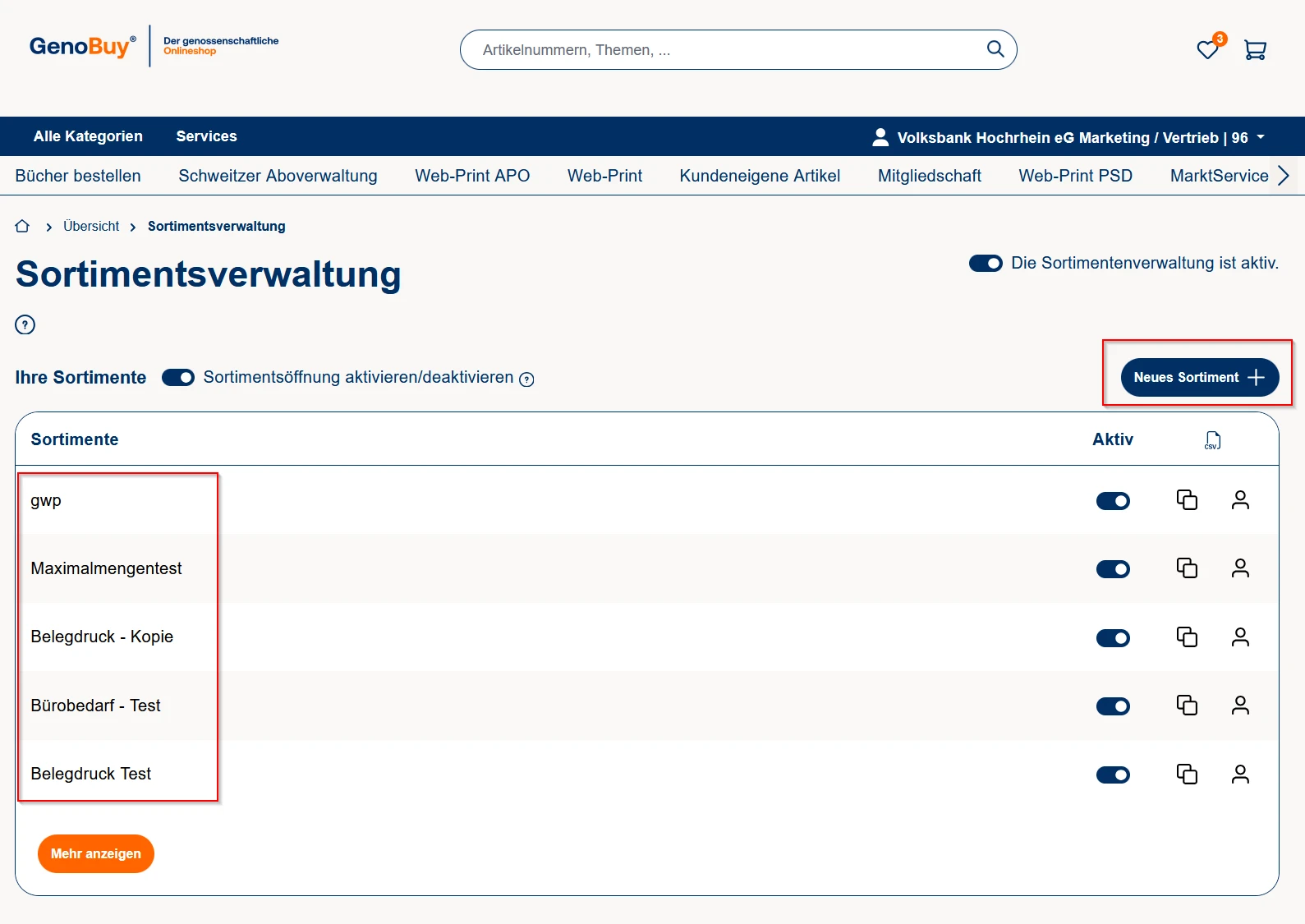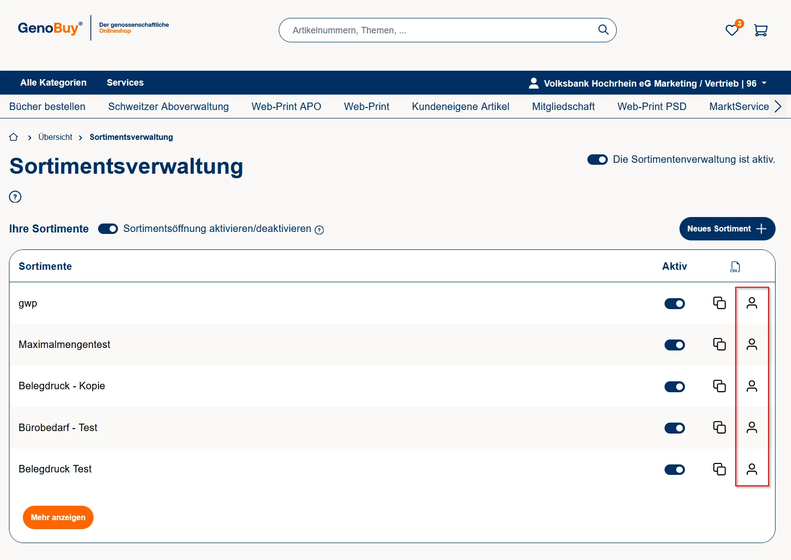 Für die jeweilige Rolle wird unter „Mein Sortiment“ die Sortimentsliste direkt angezeigt.