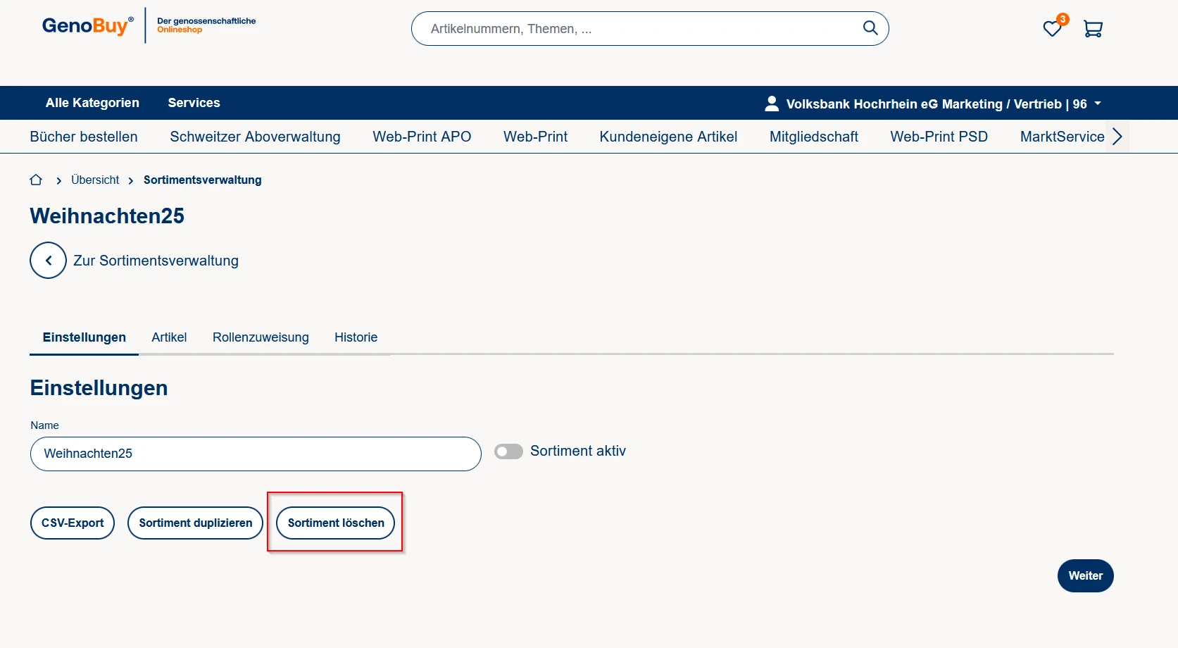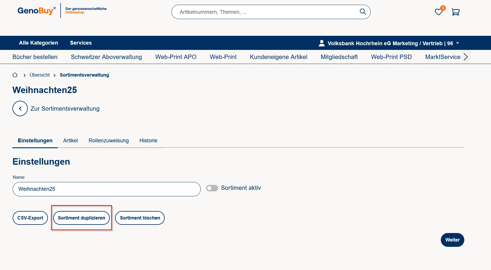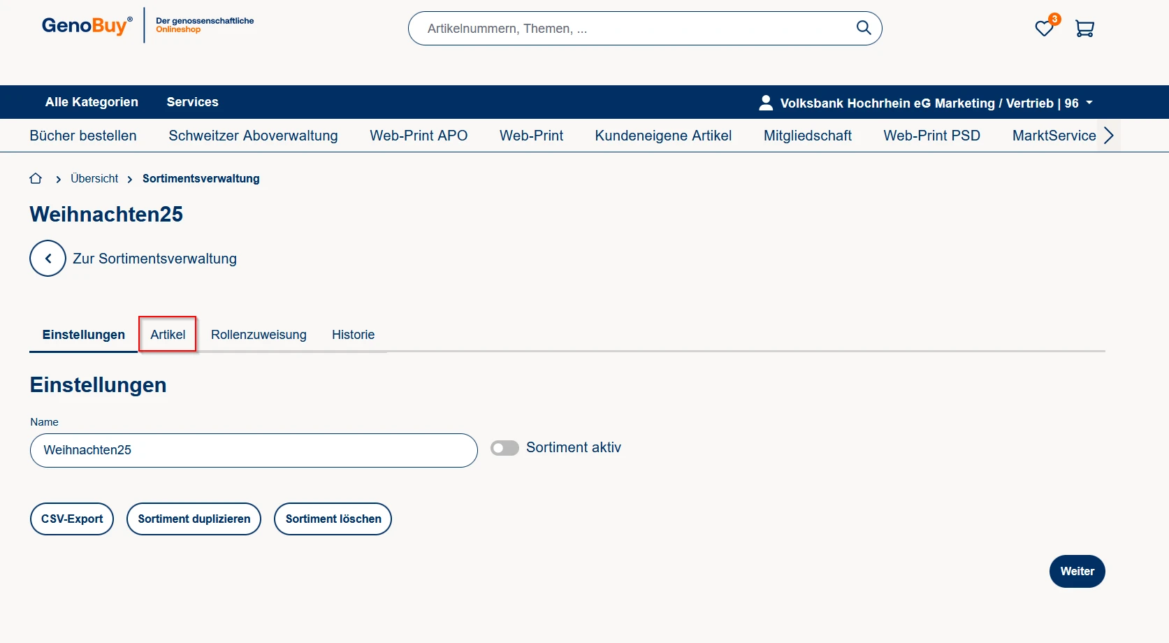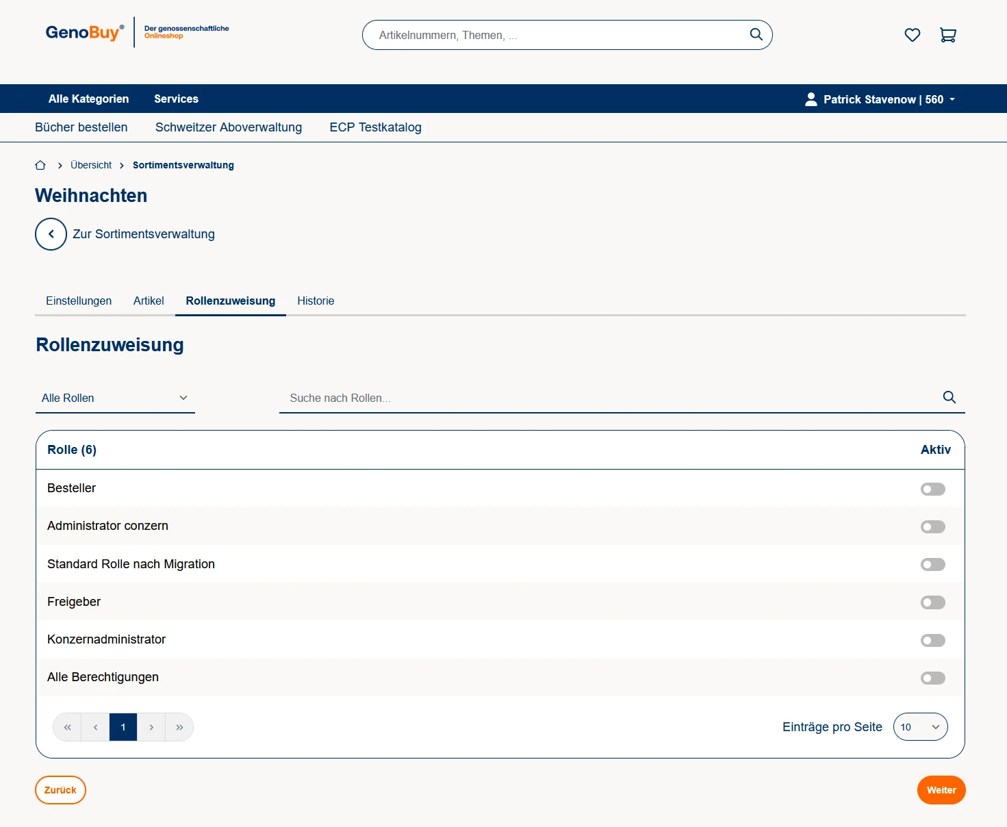 Für die jeweilige Rolle wird unter „Mein Sortiment“ die Sortimentsliste direkt angezeigt.