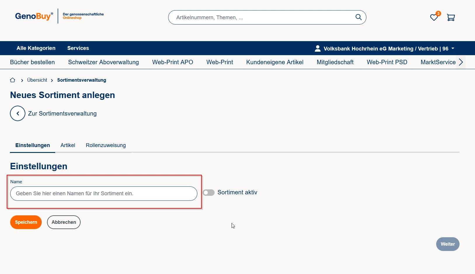 Mit Klick auf ein Sortiment oder "Neues Sortiment" gelangt man auf die Detailseite des Sortiments.