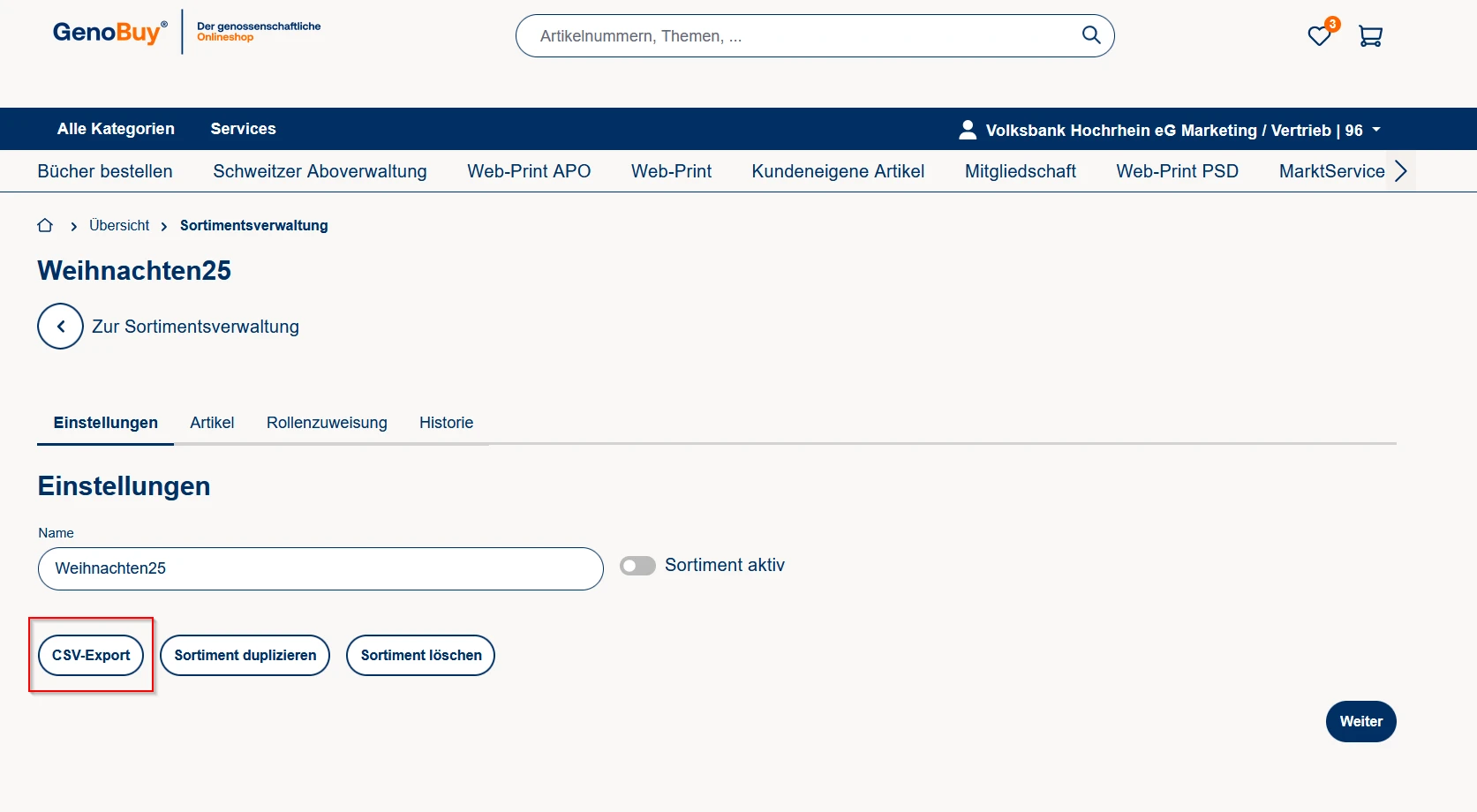 Das Sortiment kann als CSV-Datei heruntergeladen werden.