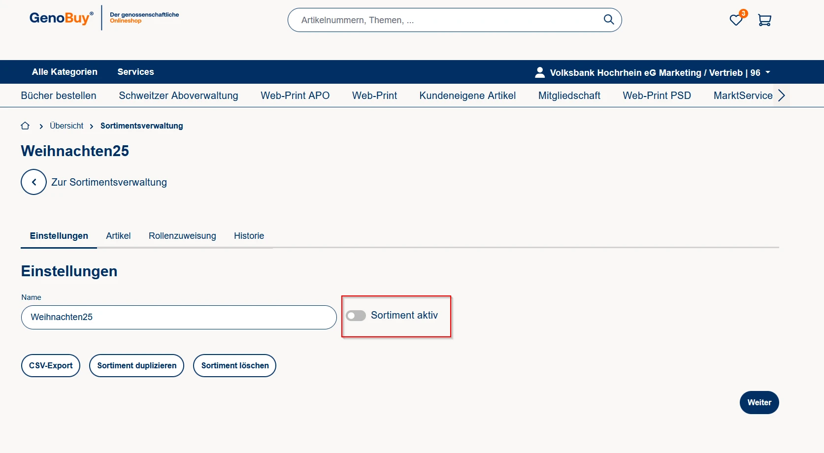 Nach dem Betätigen des Schiebereglers wird das Sortiment aktiviert und kann genutzt werden.