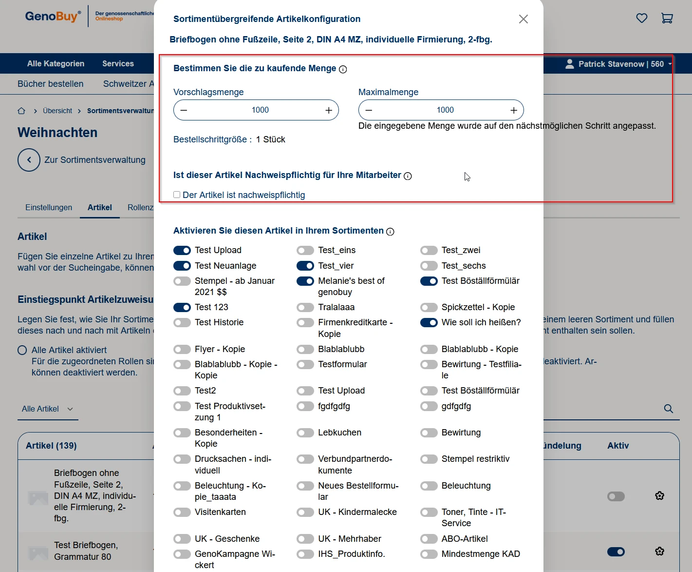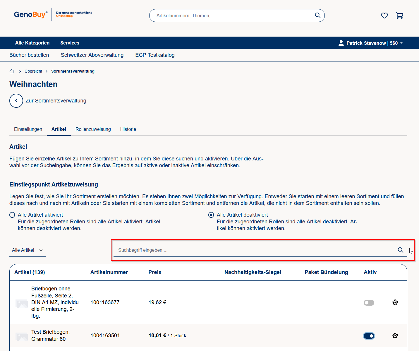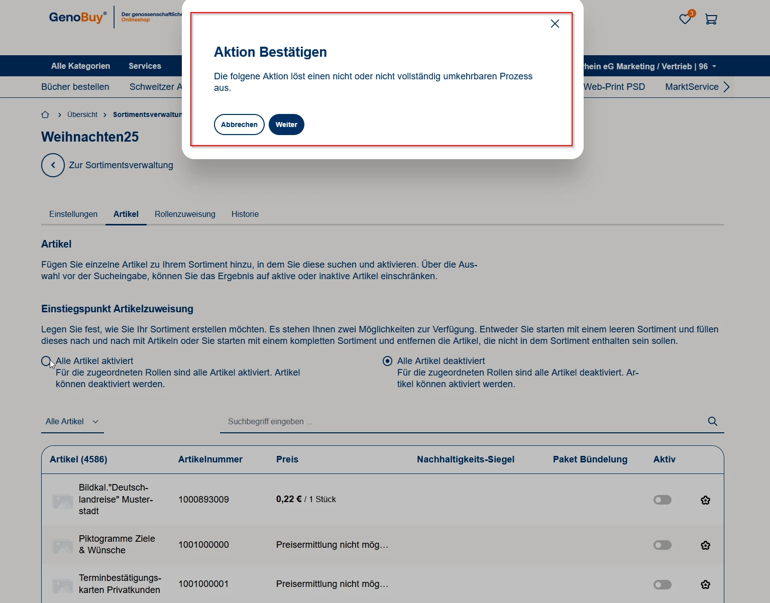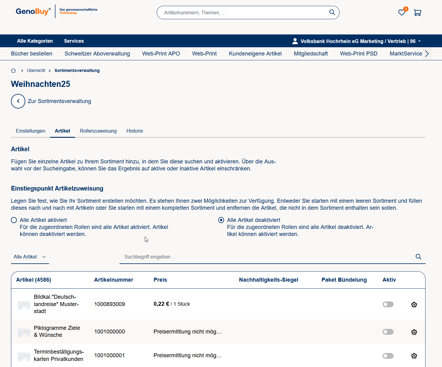 Sortimentsöffnung aktiviert: Rollen sehen zusätzlich zu ihrem eingeschränkten Sortiment das vollständige Gesamtsortiment. Artikel außerhalb des zugewiesenen Sortiments werden jedoch nur zur Ansicht angezeigt – sie sind nicht bestellbar oder individualisierbar.