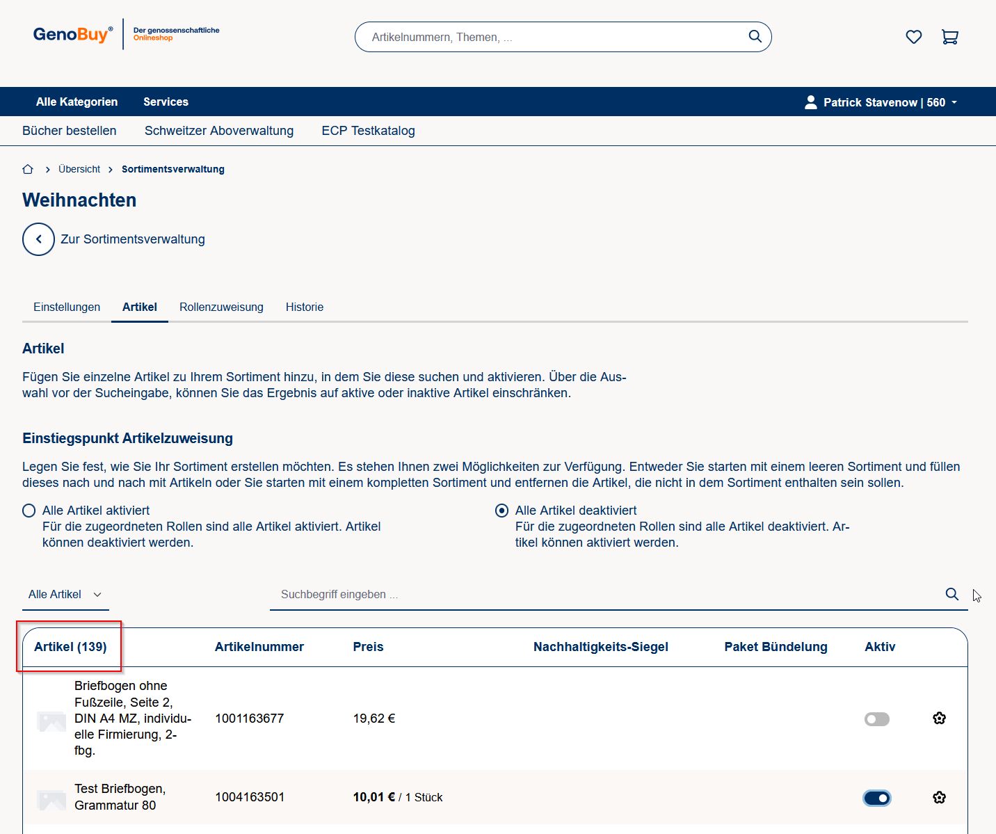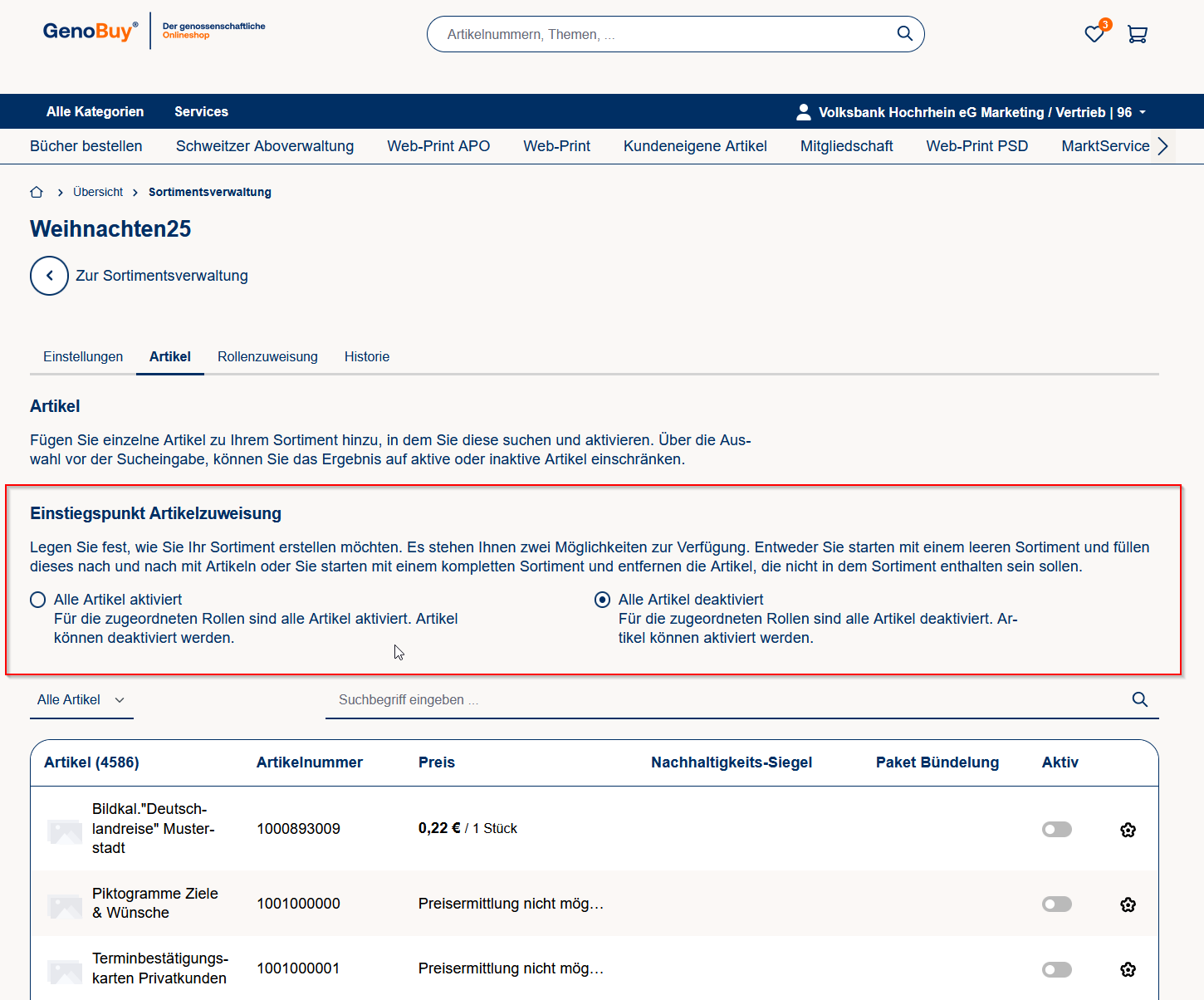 Für die Artikelzuweisung werden als Einstiegspunkt die Artikel deaktiviert dargestellt und können nach Bedarf aktiviert werden. Sie können auch den Einstiegspunkt ändern und alle Artikel zuerst aktivieren.
