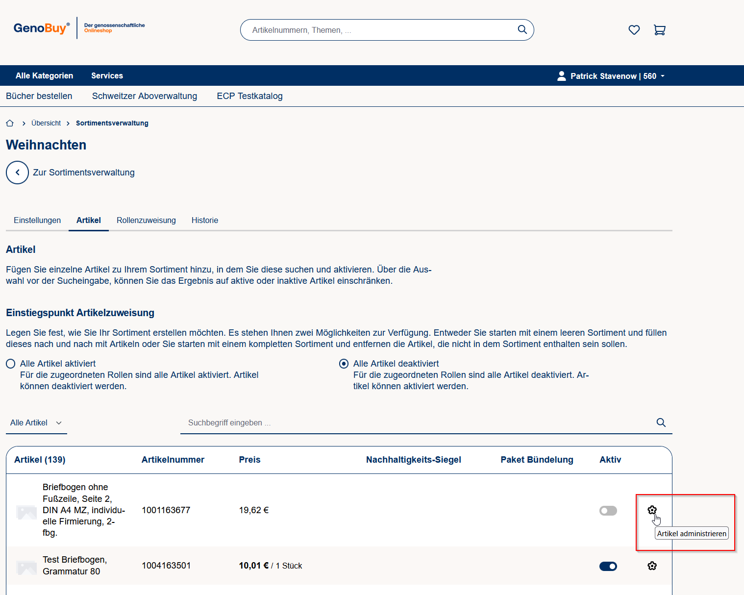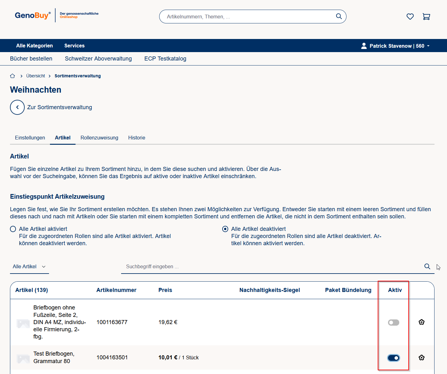 Ein blauer Schalter (rechts) zeigt an, dass das Sortiment für diesen Artikel aktiviert ist.