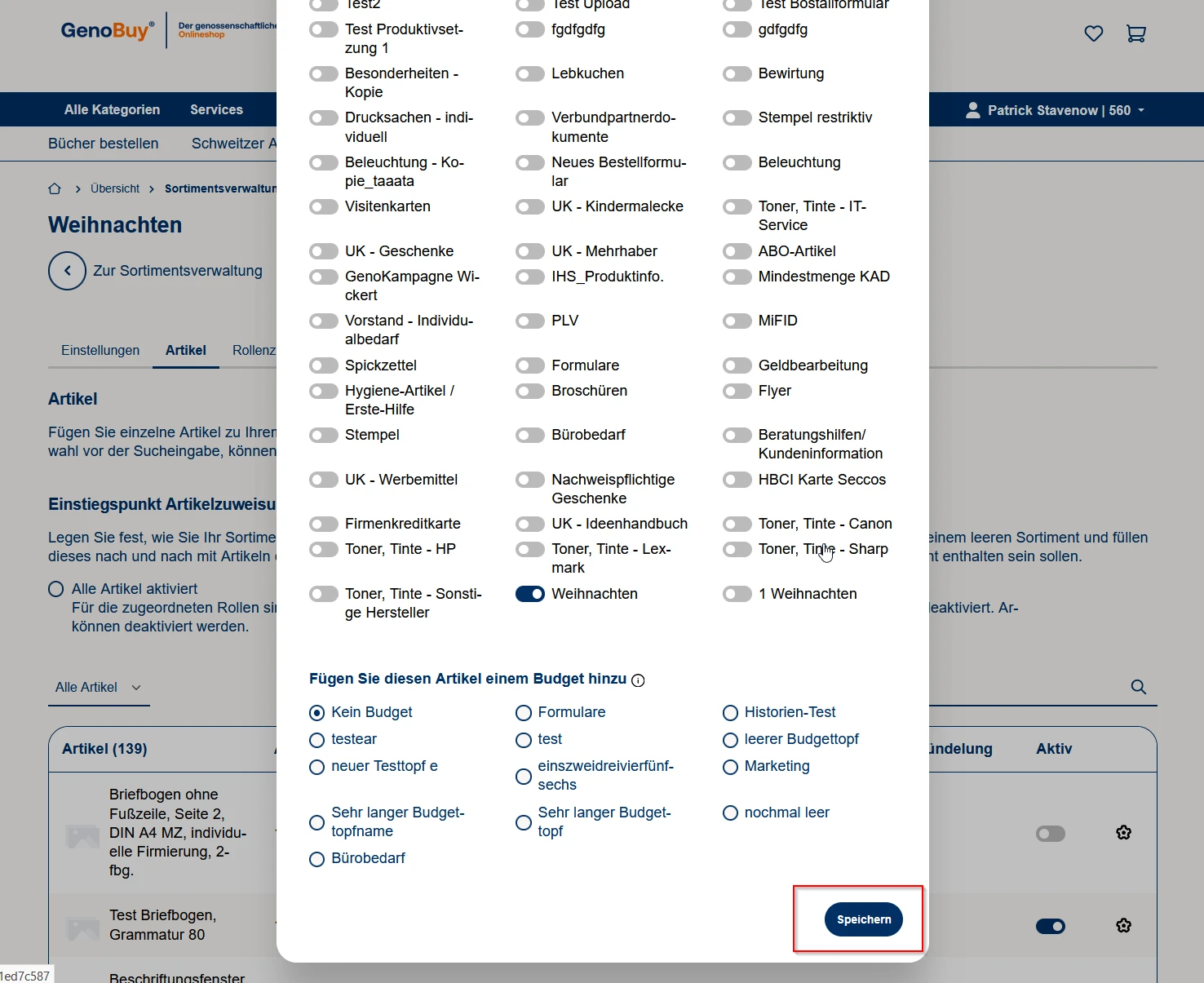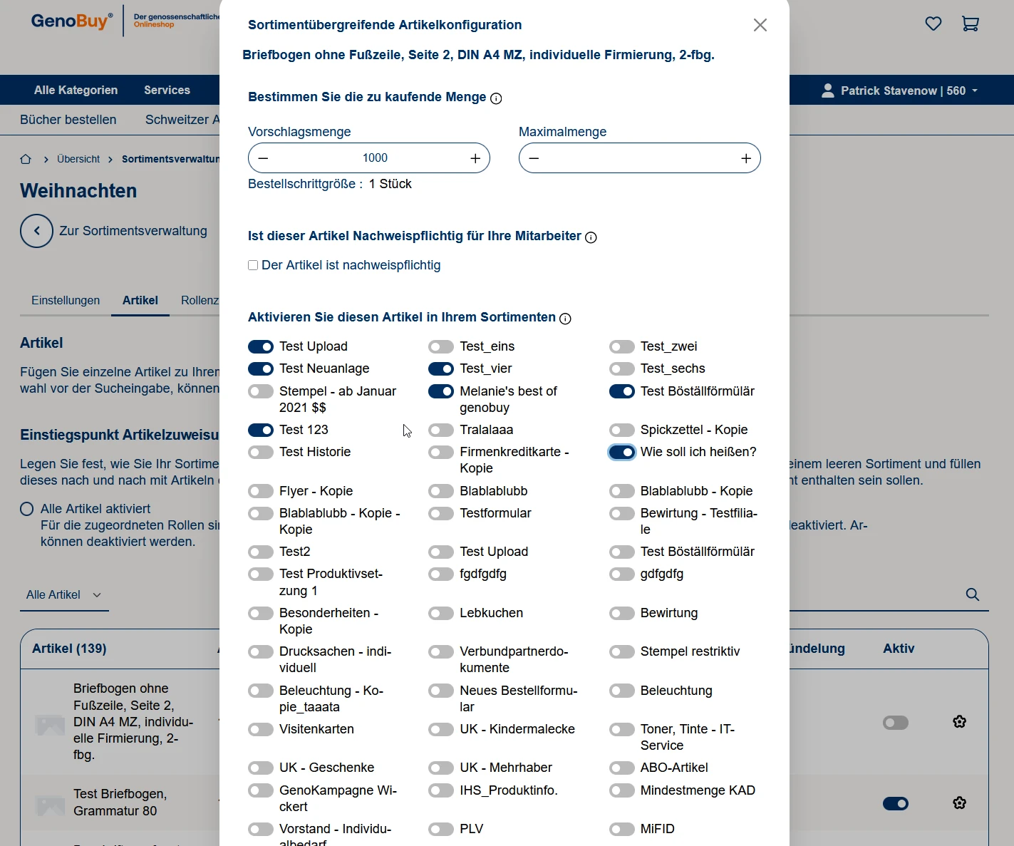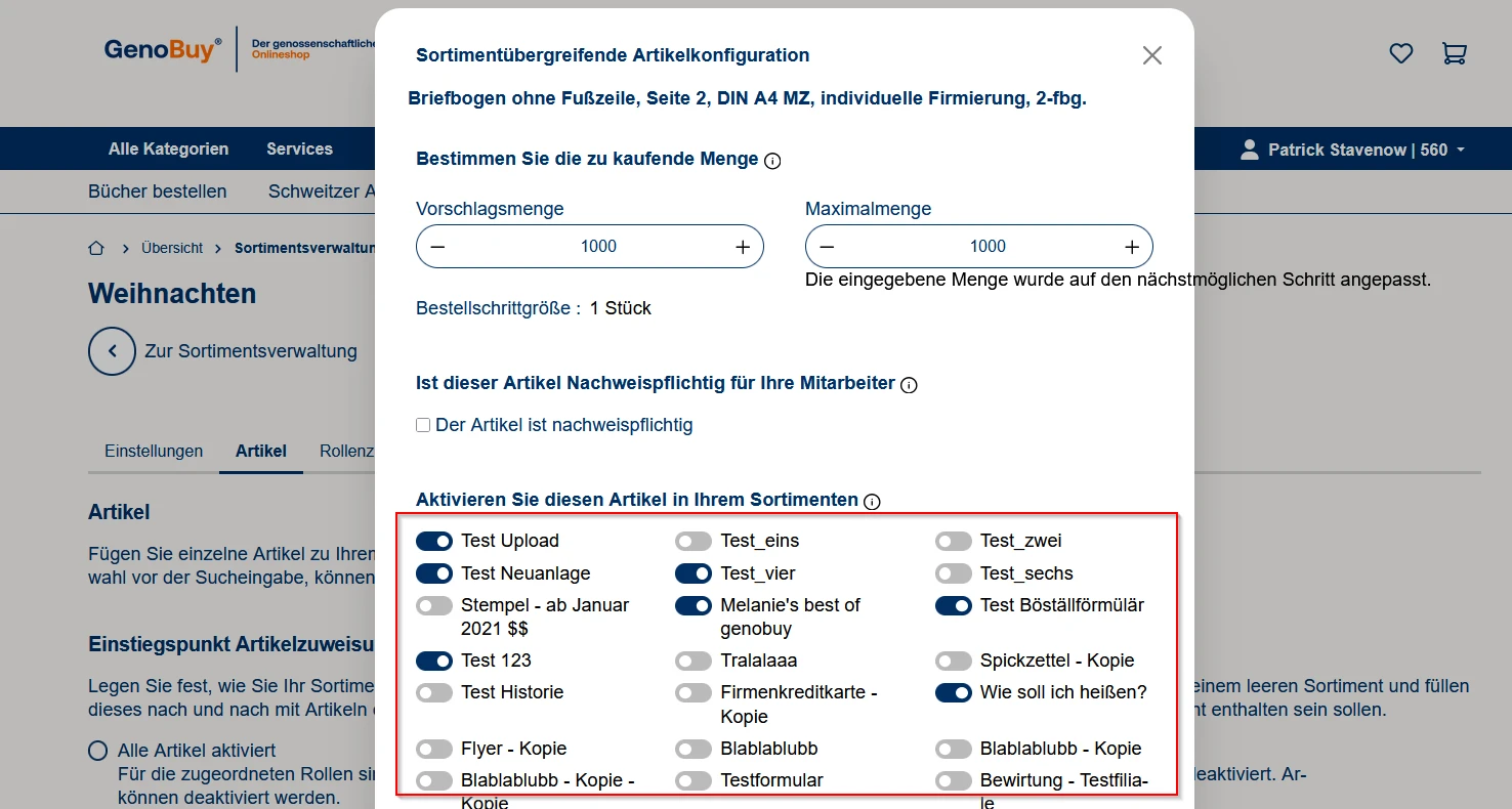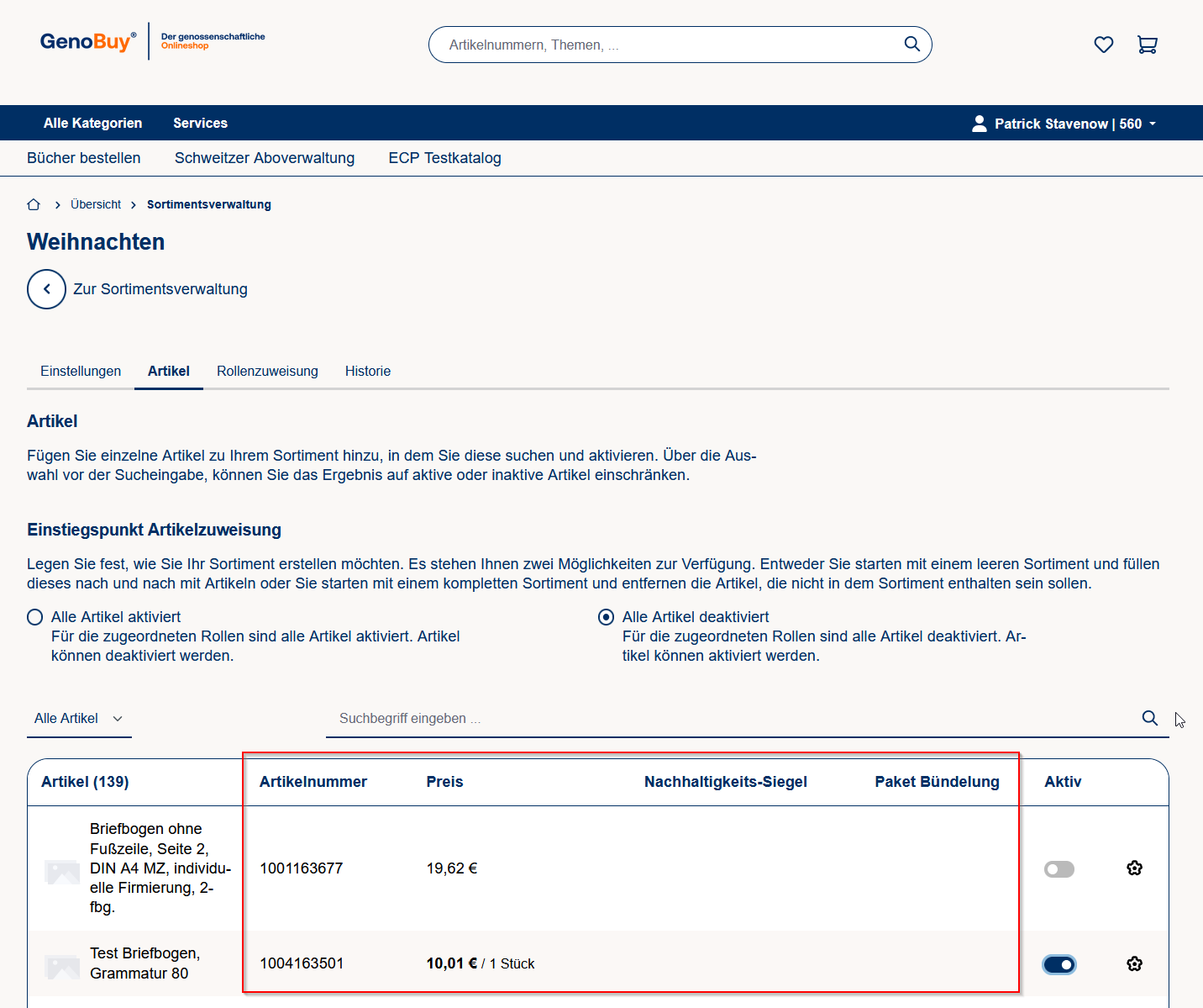 Die aktivierten Schieberegler zeigen an, wenn der Artikel bereits im Sortiment des Konzerns enthalten ist.