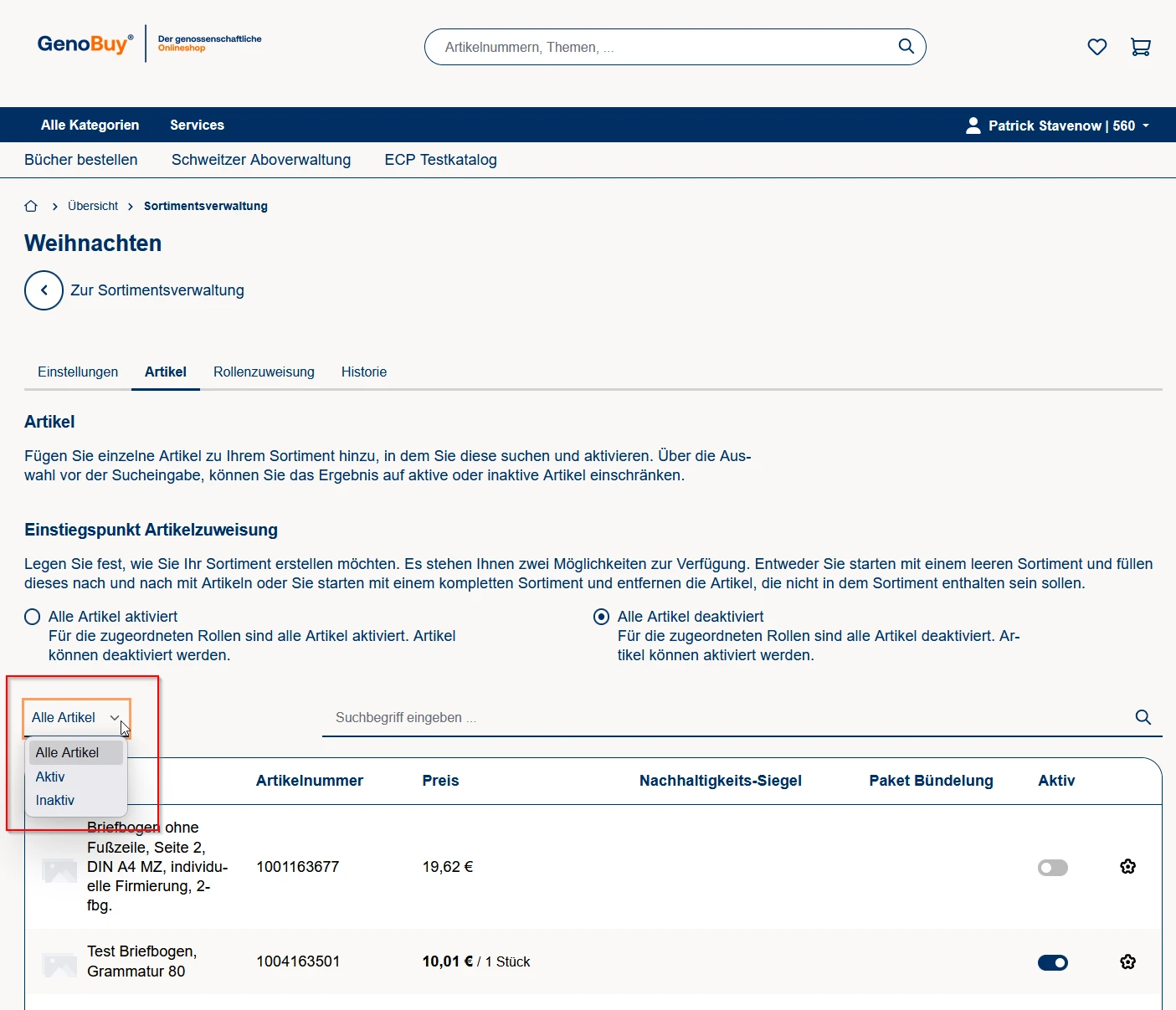 Im Drop-down-Menü stehen drei Filteroptionen zur Auswahl: aktive, inaktive oder alle Artikel.