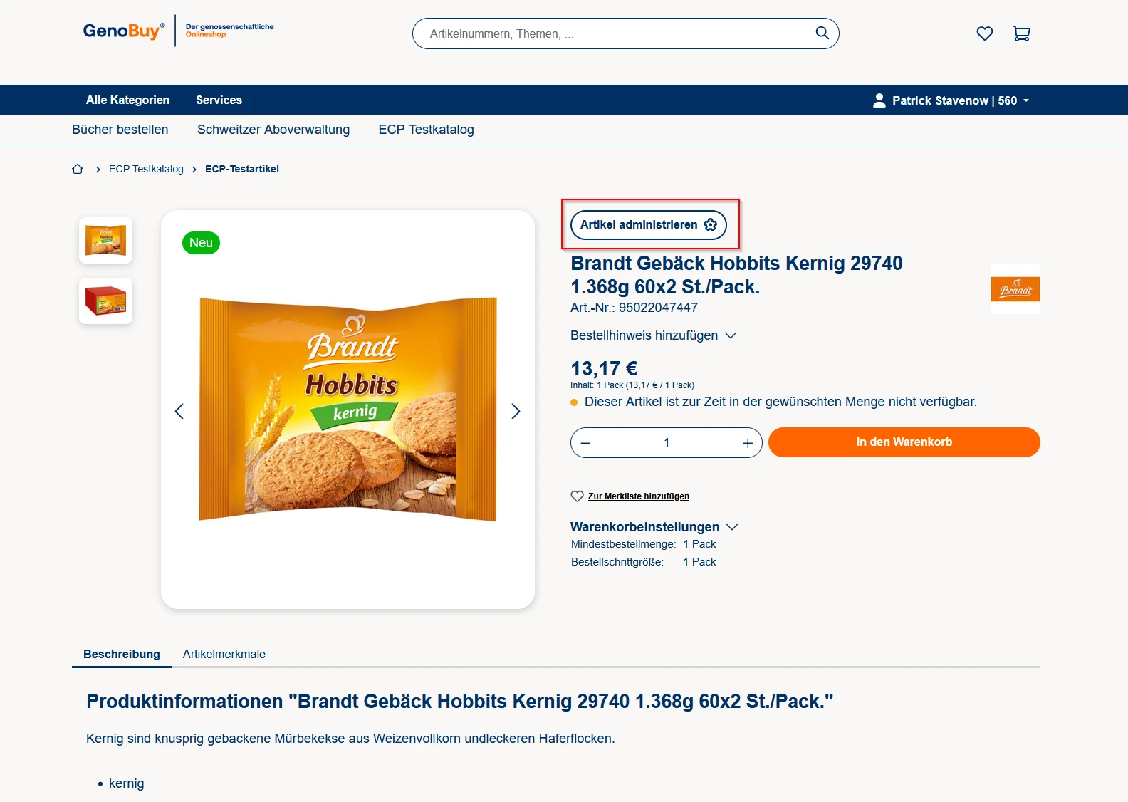 Die Artikel werden mit allen Informationen angezeigt: Artikelname, Artikelnummer, Artikeltexte, Nachhaltigkeits-Siegel, Lagerartikel sowie den Preis des Artikels.