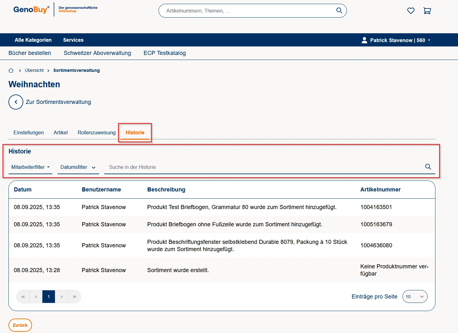 In der Historie werden alle Änderungen des jeweiligen Sortiments dokumentiert und können zu einem späteren Zeitpunkt nachvollzogen werden. Es werden sowohl Änderungen aus der Benutzeroberfläche als auch aus dem Systembereich angezeigt. Zusätzlich kann mit einem Mitarbeiterfilter, Datumsfilter oder über die Suchfunktion gefiltert werden.