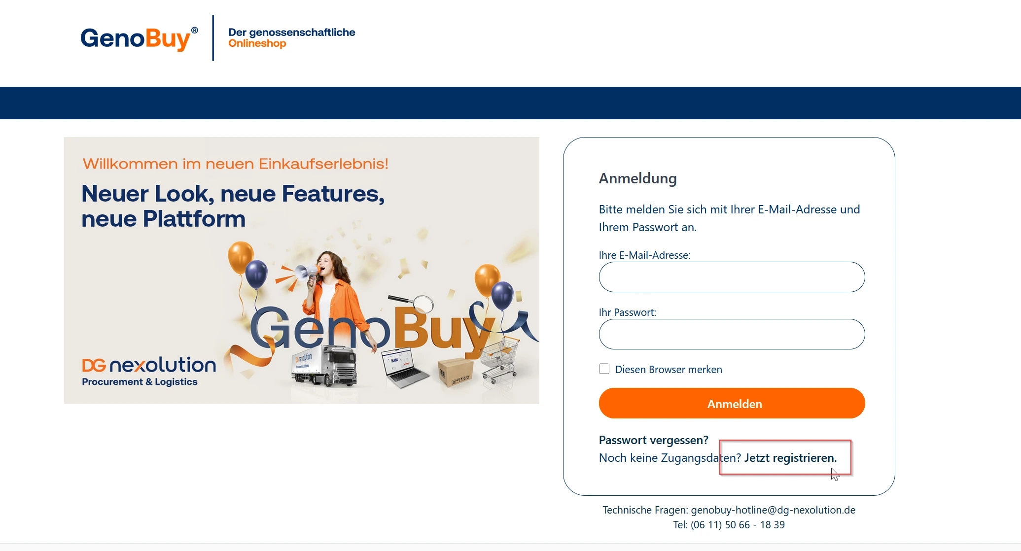Klicken Sie bei der Anmeldemaske auf "Jetzt registrieren", um ein neues Konto in GenoBuy anzulegen.