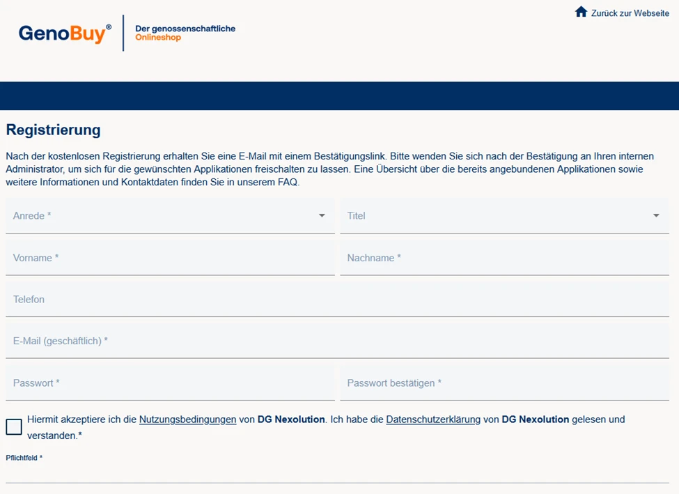 Wenn Sie das erste Mal GenoBuy verwenden möchten, müssen Sie sich zuerst mit Ihren Daten registrieren. Bitte beachten Sie die Passwortrichtlinien. Nach Ihrer Registrierung erhalten Sie eine E-Mail mit einem Bestätigungslink. Bitte bestätigen Sie Ihre Registrierung über diesen Link. Eine zusätzliche Freischaltung im CIAM für den Zugriff auf GenoBuy ist nicht erforderlich.