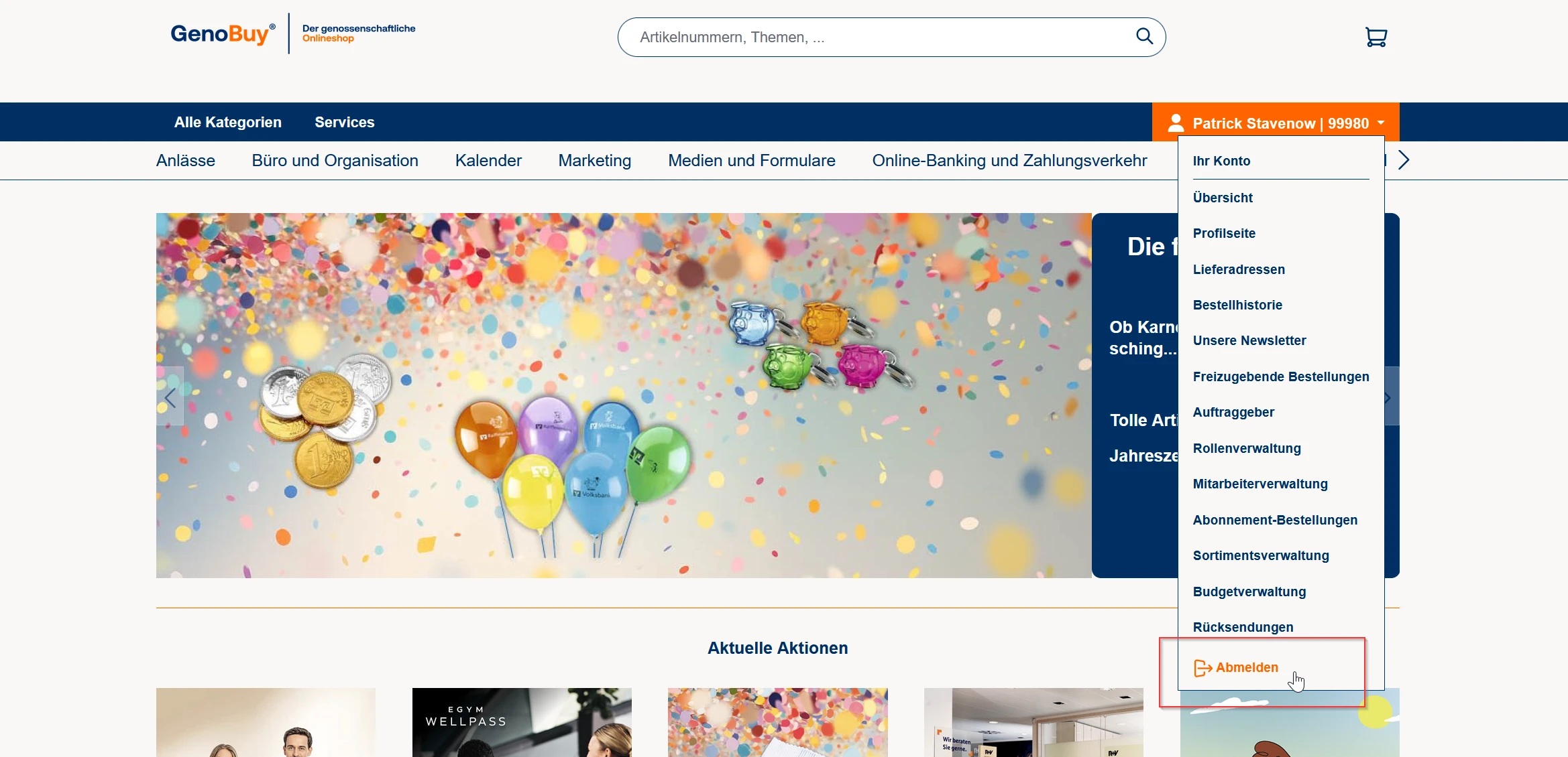 Um sich abzumelden, wählen SIe unter "Ihr Konto":„Abmelden“ Nach dem Logout gelangen Sie automatisch wieder zur Prelogin-Seite.