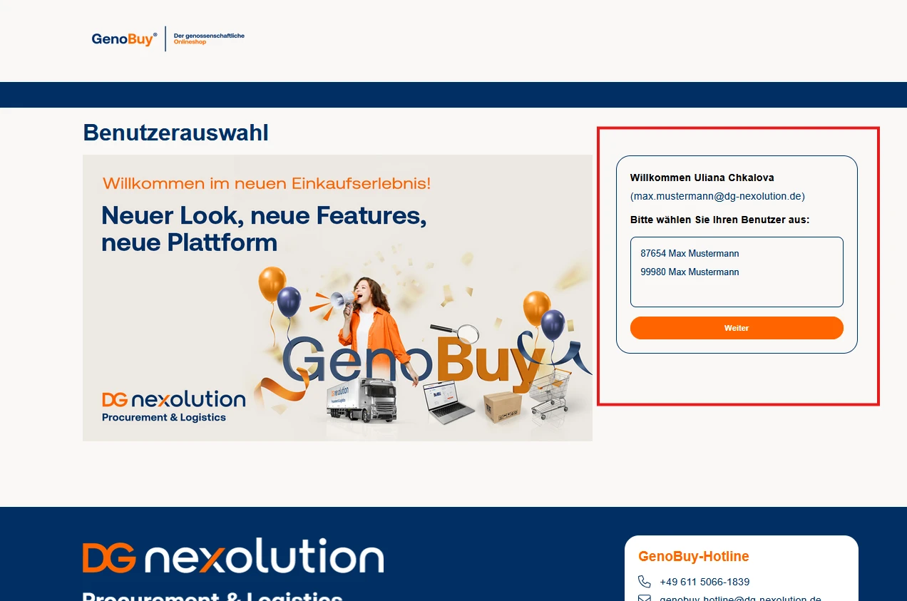 Nachdem Sie Ihre Anmeldeinformationen eingegeben und bestätigt haben, werden Sie für den zweiten Anmeldeschritt auf die Seite zur Auswahl Ihrer Kundennummer und zugehörigen Benutzernamen weitergeleitet. Falls Sie für mehrere GenoBuy-Logins berechtigt sind, können Sie die jeweils gewünschte Kundennummer mit dazugehörigem Benutzernamen in der Auswahlliste auswählen.
